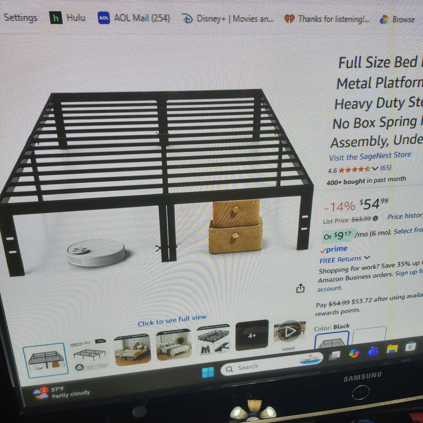 Selling a full-size bed frame made of black metal. This is a 14-inch metal platform bed frame with heavy-duty steel slat support. It's designed so no box spring is needed, and it's easy to assemble with under-bed storage, available for a great price!