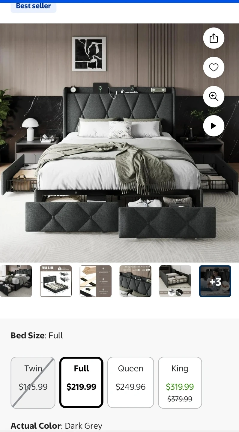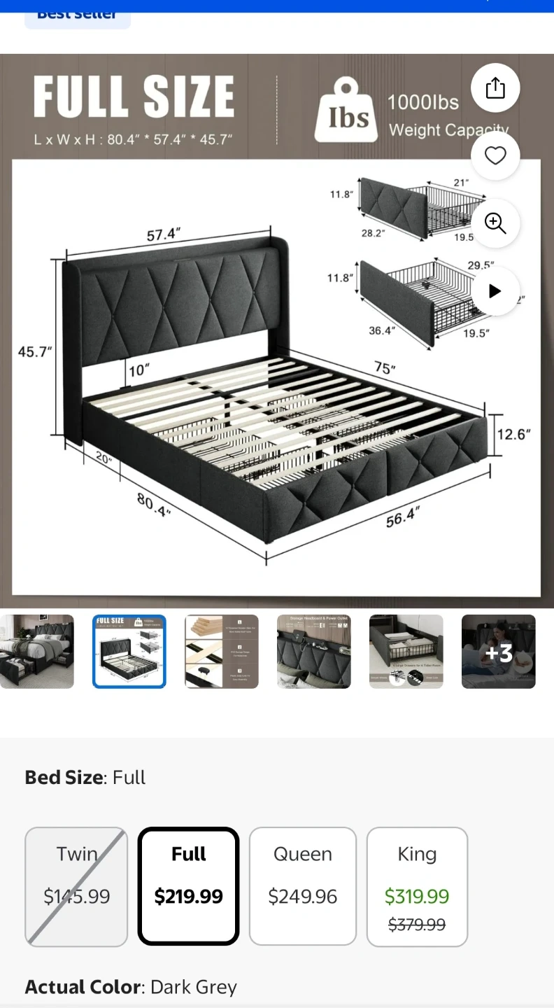 This iPormis full size bed frame is upholstered in dark grey fabric. It features a headboard with a built-in charging station, including 2 AC outlets, 1 USB-C, and 1 USB port. Four storage drawers are included under the bed. Bed size is full. Overall dimensions are 80.4" L x 57.4" W x 45.7" H.