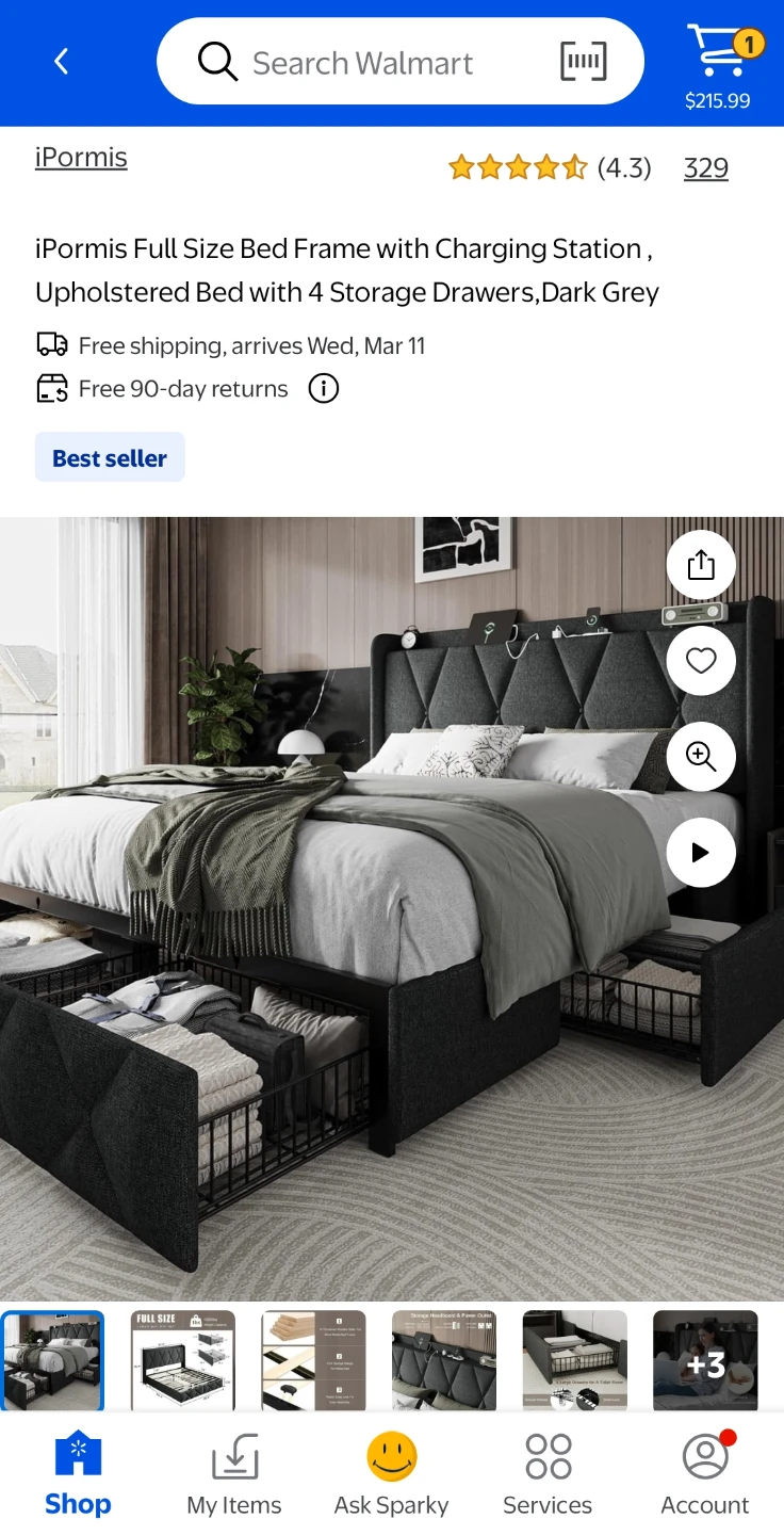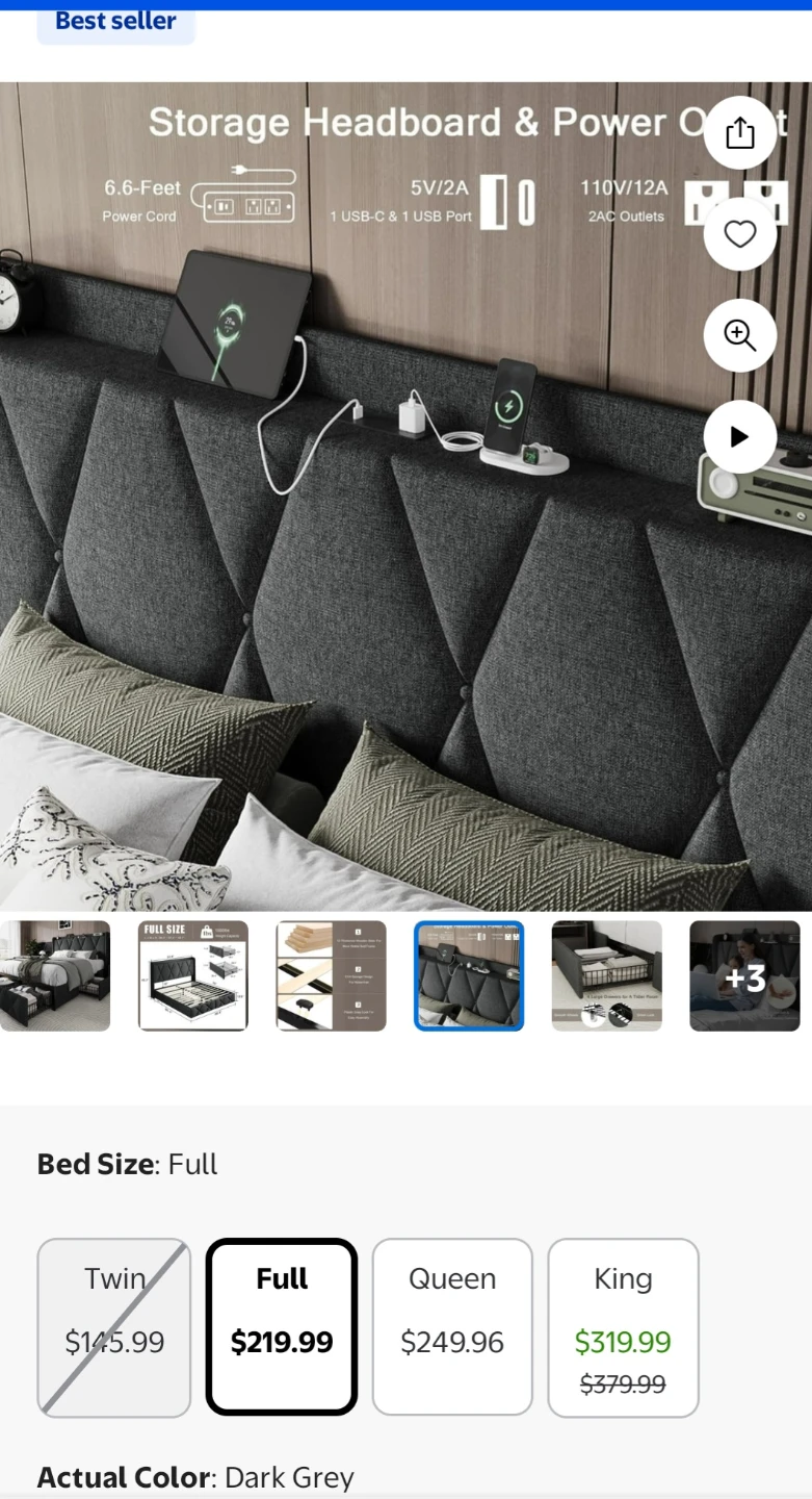 This iPormis full size bed frame is upholstered in dark grey fabric. It features a headboard with a built-in charging station, including 2 AC outlets, 1 USB-C, and 1 USB port. Four storage drawers are included under the bed. Bed size is full. Overall dimensions are 80.4" L x 57.4" W x 45.7" H.