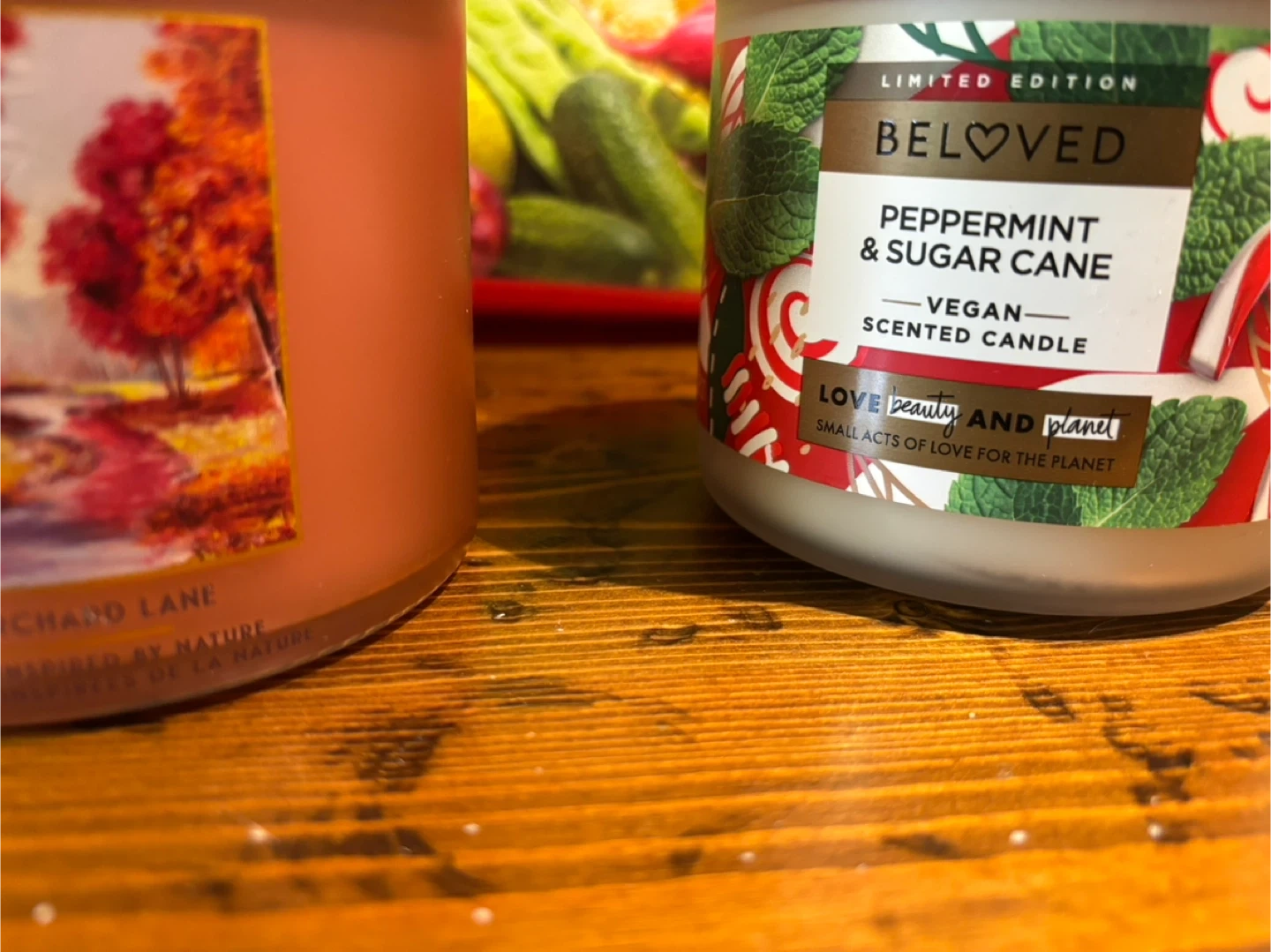Two three-wick candles. One is "Apple Orchard Lane" from White Barn Nature. The other is a "Limited Edition Beloved Peppermint & Sugar Cane" vegan scented candle from Love Beauty And Planet. They're ready to add a nice aroma to your space!