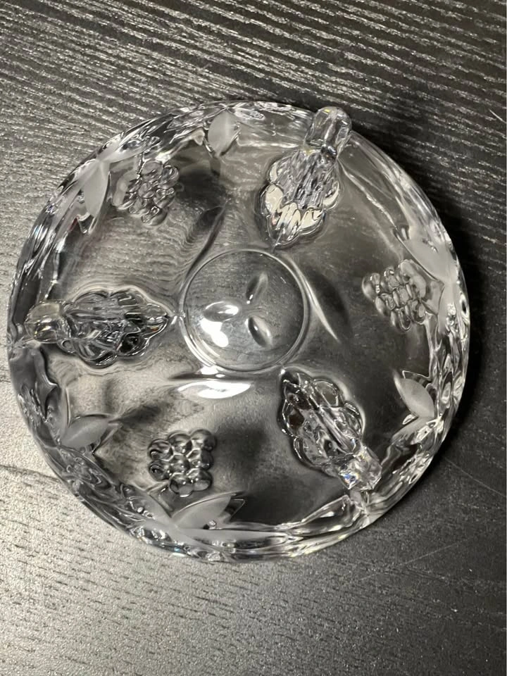Beautiful Mikasa Garden Terrace crystal bowl with a lovely etched grape and leaf pattern. It has a scalloped rim and stands on three decorative feet. This discontinued pattern makes it a great collectible. Perfect for candy, nuts, or as a decorative accent. Pre-owned. Pickup is at 58th and 7th Ave in midtown Manhattan.
