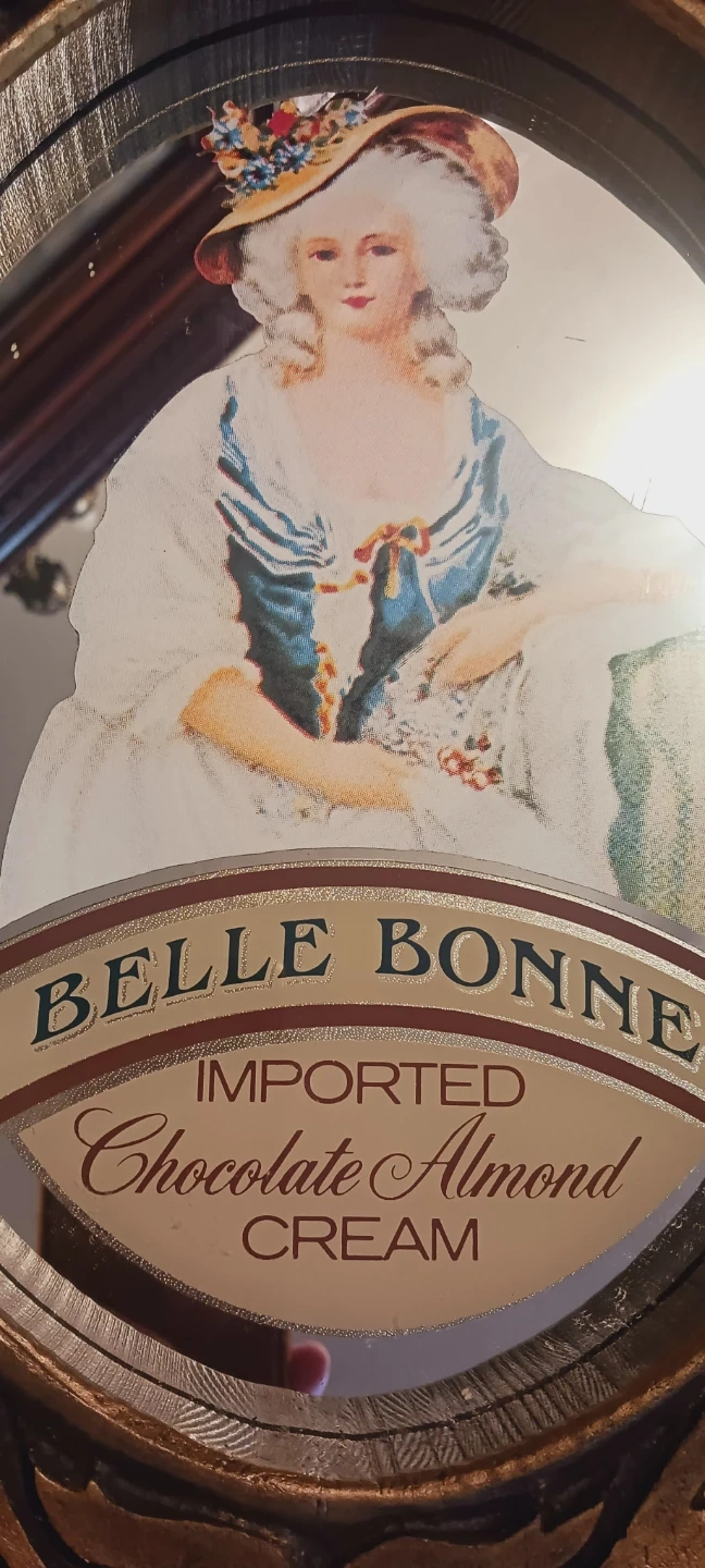 This is a Collectible Liquor Advertising Mirror for a Chocolate Liqueur" Belle Bonne imported Chocolate Almond Cream". It features an ornate gold frame and a vintage portrait. 13"×10". Excellent condition. ALL MY PRICES ARE NEGOTIABLE !!