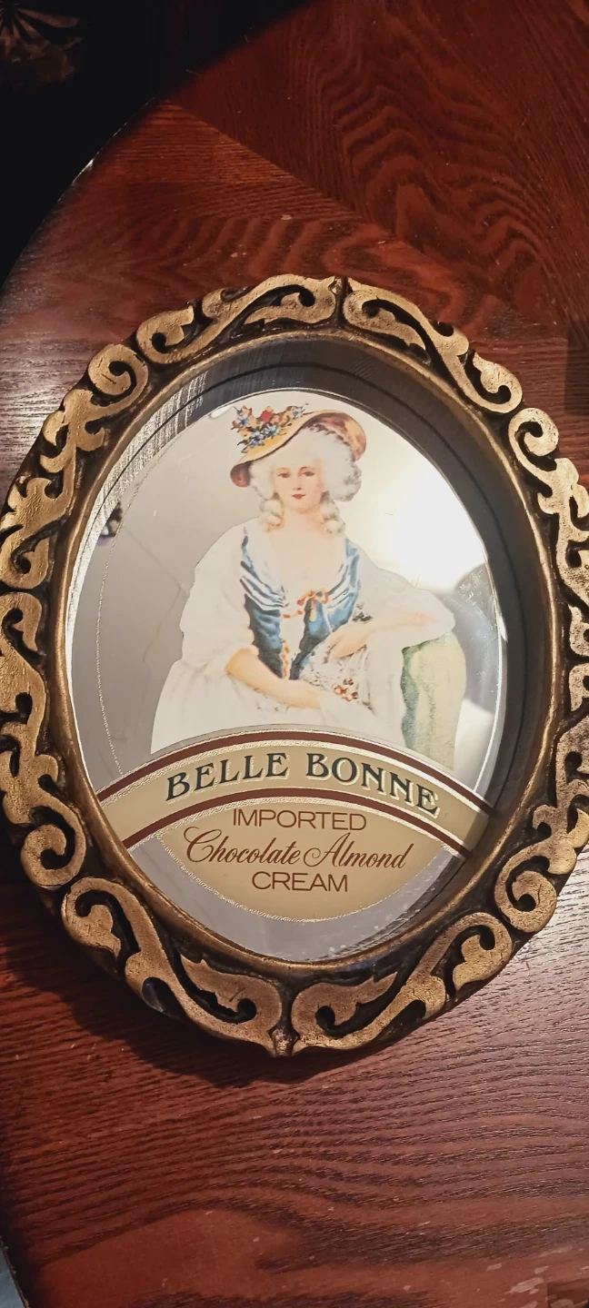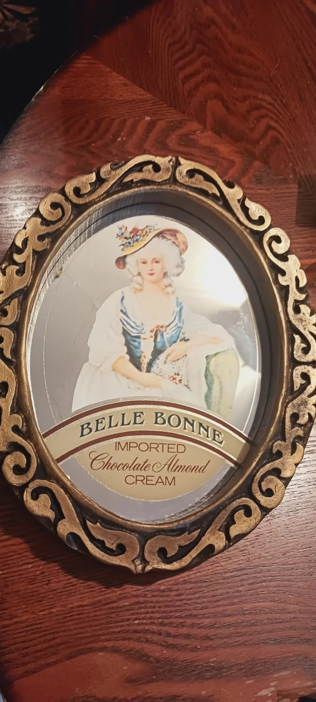 This is a Collectible Liquor Advertising Mirror for a Chocolate Liqueur" Belle Bonne imported Chocolate Almond Cream". It features an ornate gold frame and a vintage portrait. 13"×10". Excellent condition. ALL MY PRICES ARE NEGOTIABLE !!
