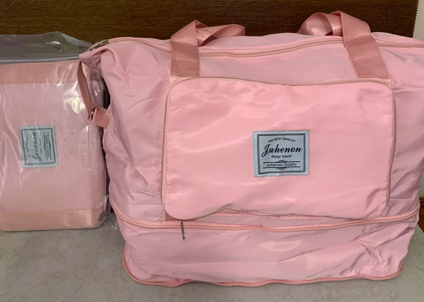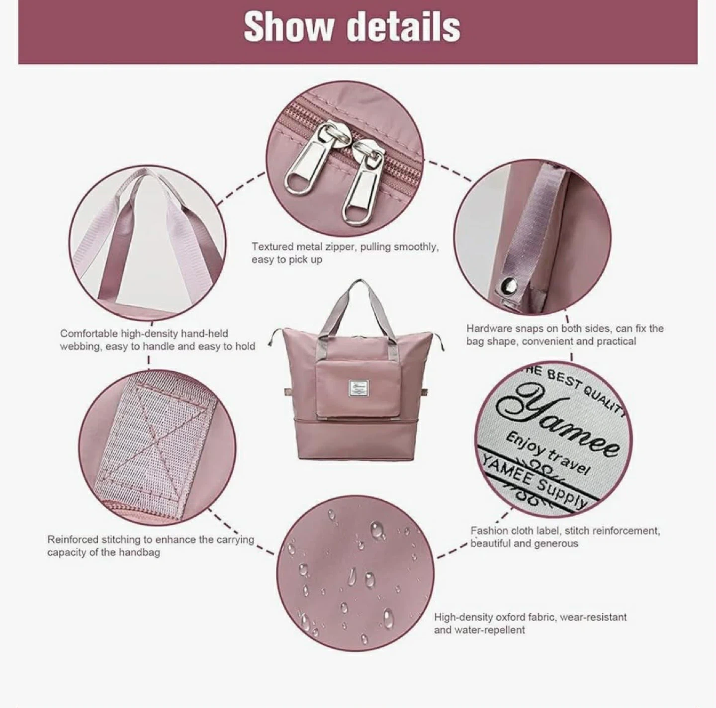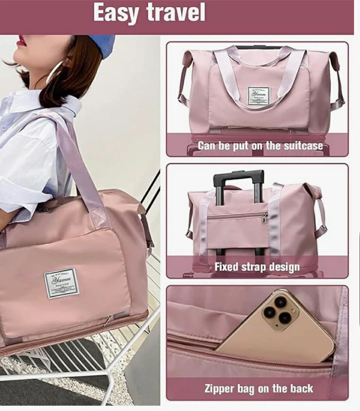 This pink duffel bag is made from high-density oxford fabric. It's water-resistant and lightweight. The bag features reinforced stitching, a textured zipper, and a pocket that can hold a phone.