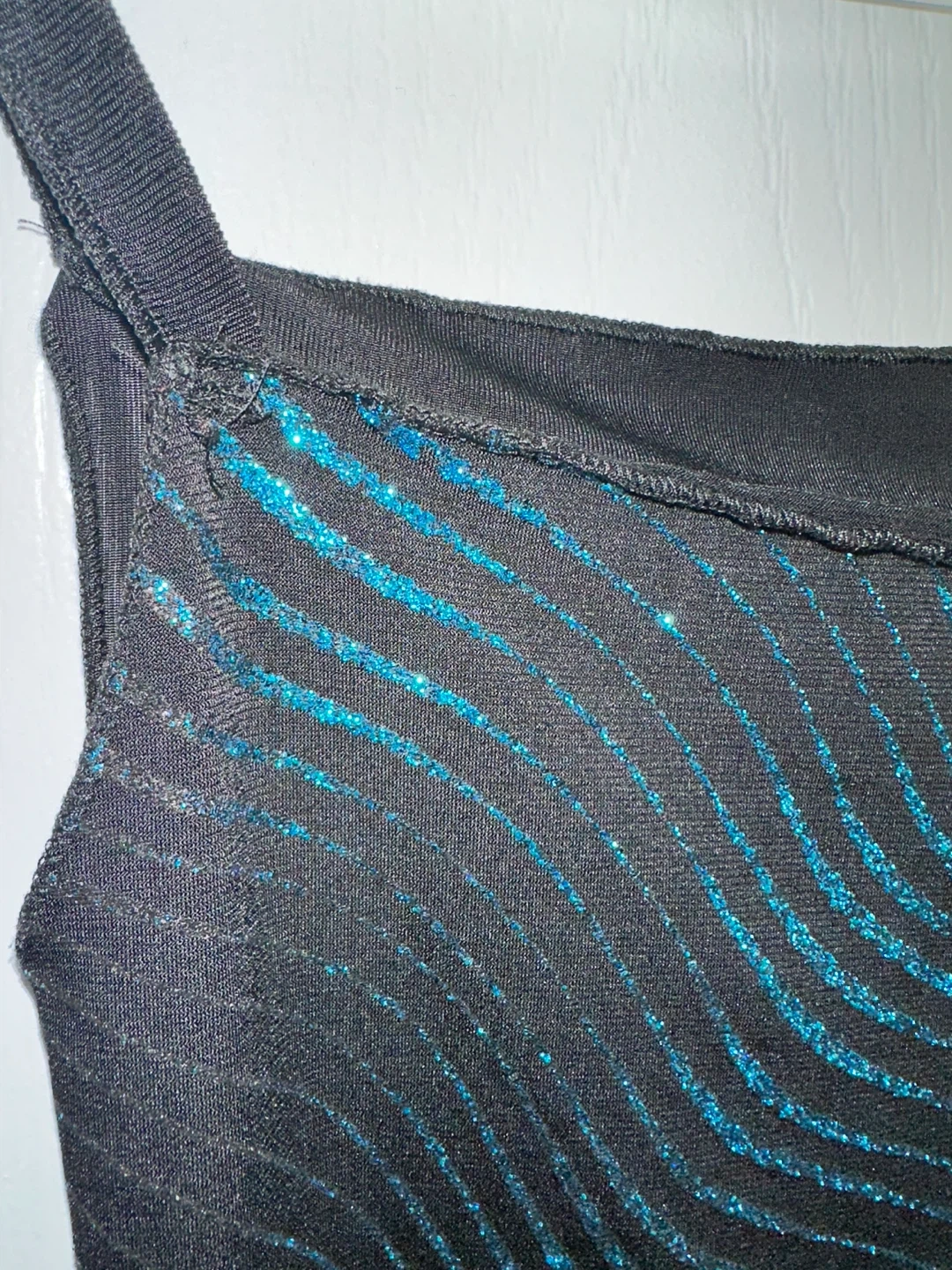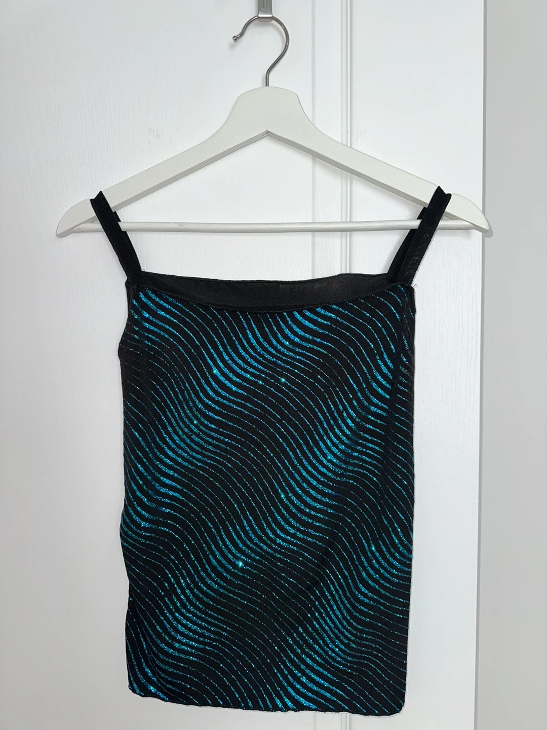 This is a gently used black tank top with wavy blue sparkly detailing. It's made of a lightweight and stretchy material. This top is great for going out!