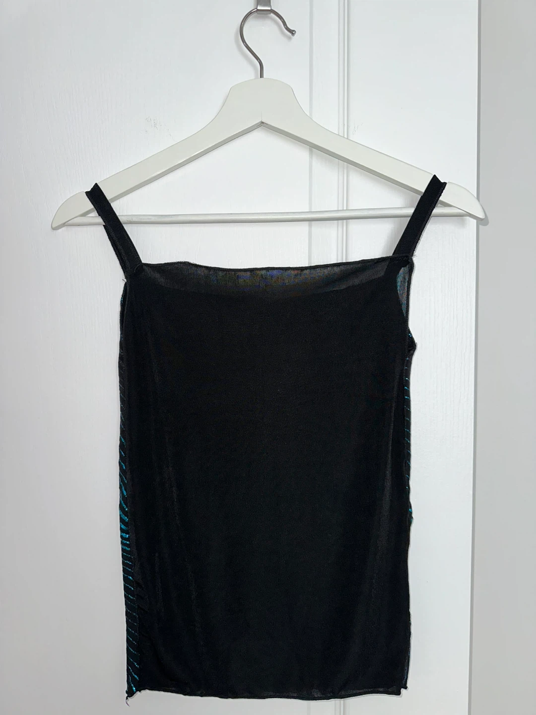 This is a gently used black tank top with wavy blue sparkly detailing. It's made of a lightweight and stretchy material. This top is great for going out!