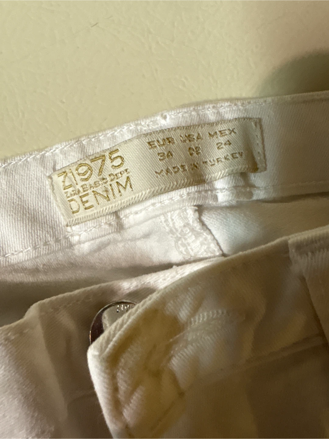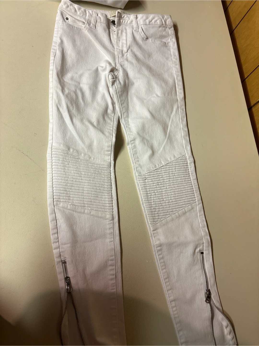 Selling a pair of Zara Basic Dept white moto jeans in size 34. They have a stylish moto design with zipper details at the ankles. They're in great shape and ready for a new owner!