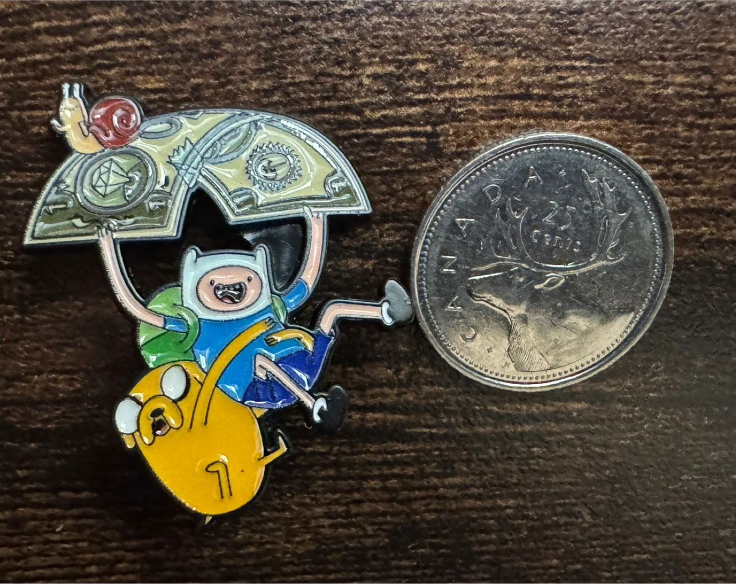 1 enamel pin showcasing Finn and Jake from Adventure Time, complete with a money umbrella and a snail perched on top.