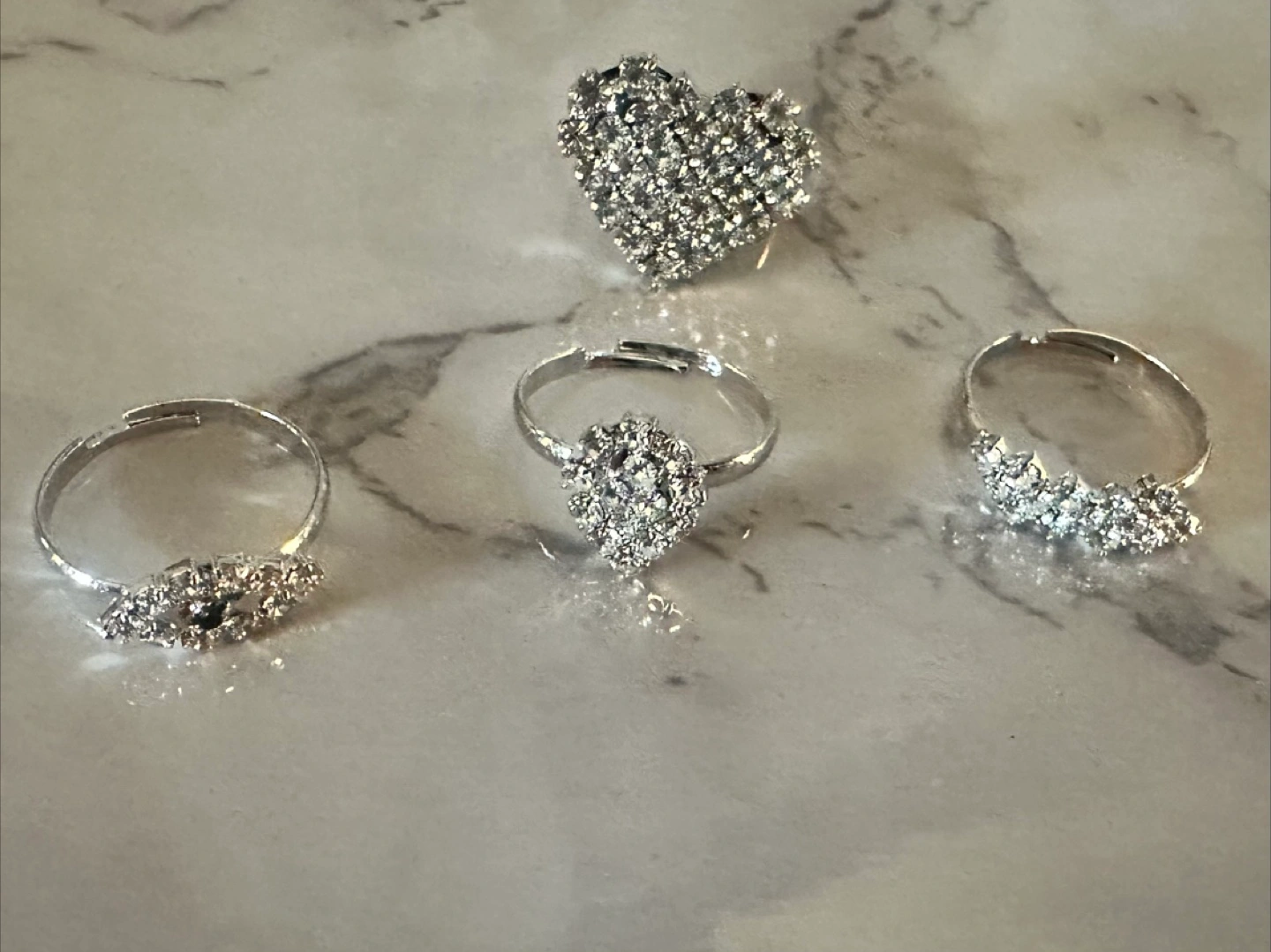 Selling a set 4 silver toe rings, each adorned with sparkling rhinestones! These adjustable rings add a touch of glamour to your toes and are perfect for summer sandals or a special occasion