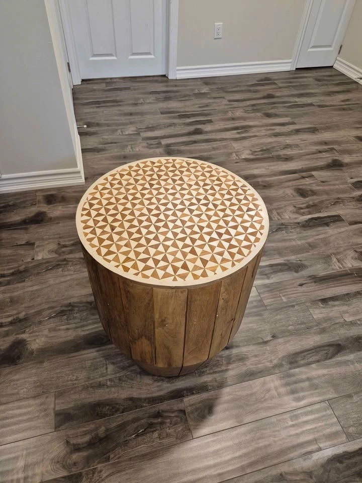 Modern Wood Drum Side Table with Geometric Inlay Top