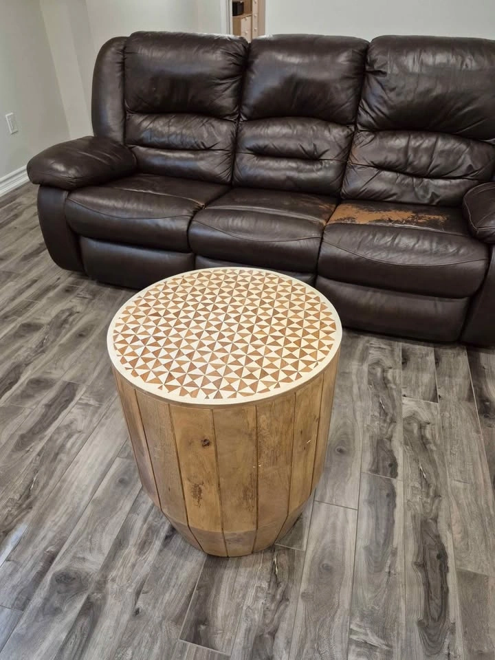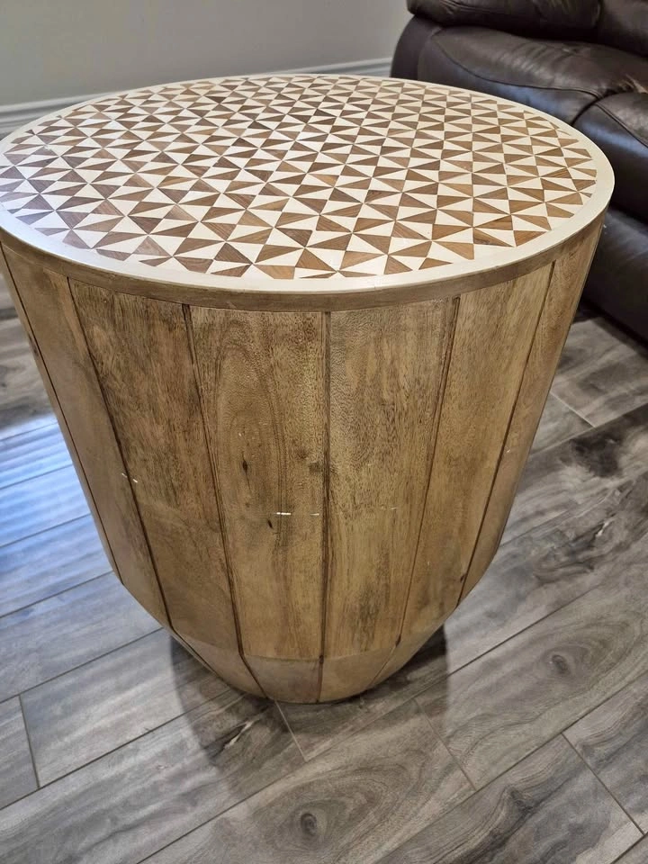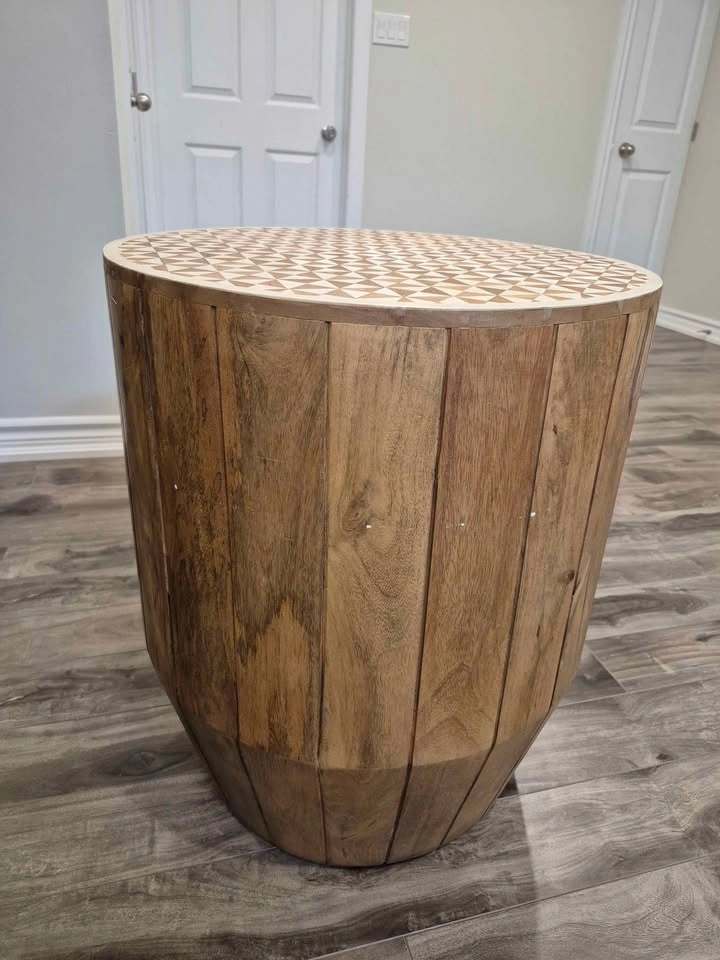 Modern Wood Drum Side Table with Geometric Inlay Top