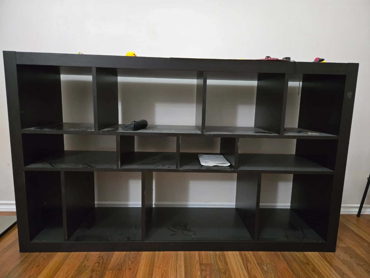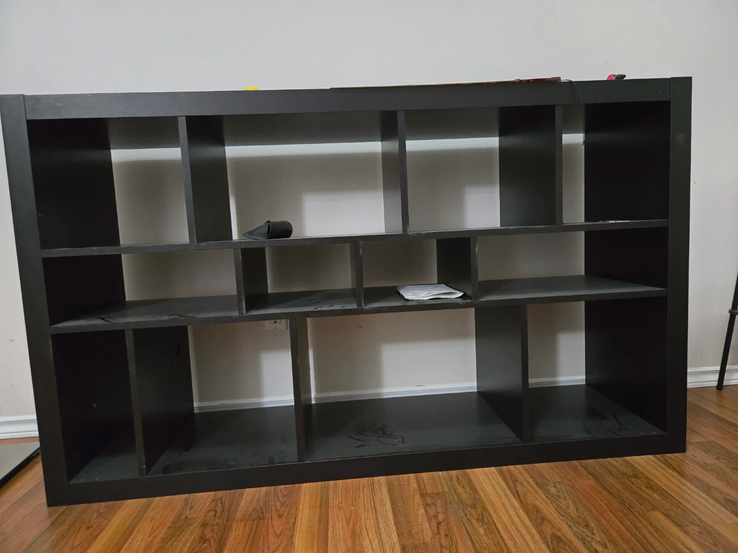 Selling a black shelf unit that's perfect for extra storage! It has a few signs of use, but it's still sturdy and functional. Great for organizing books, decor, or anything else you need to keep tidy