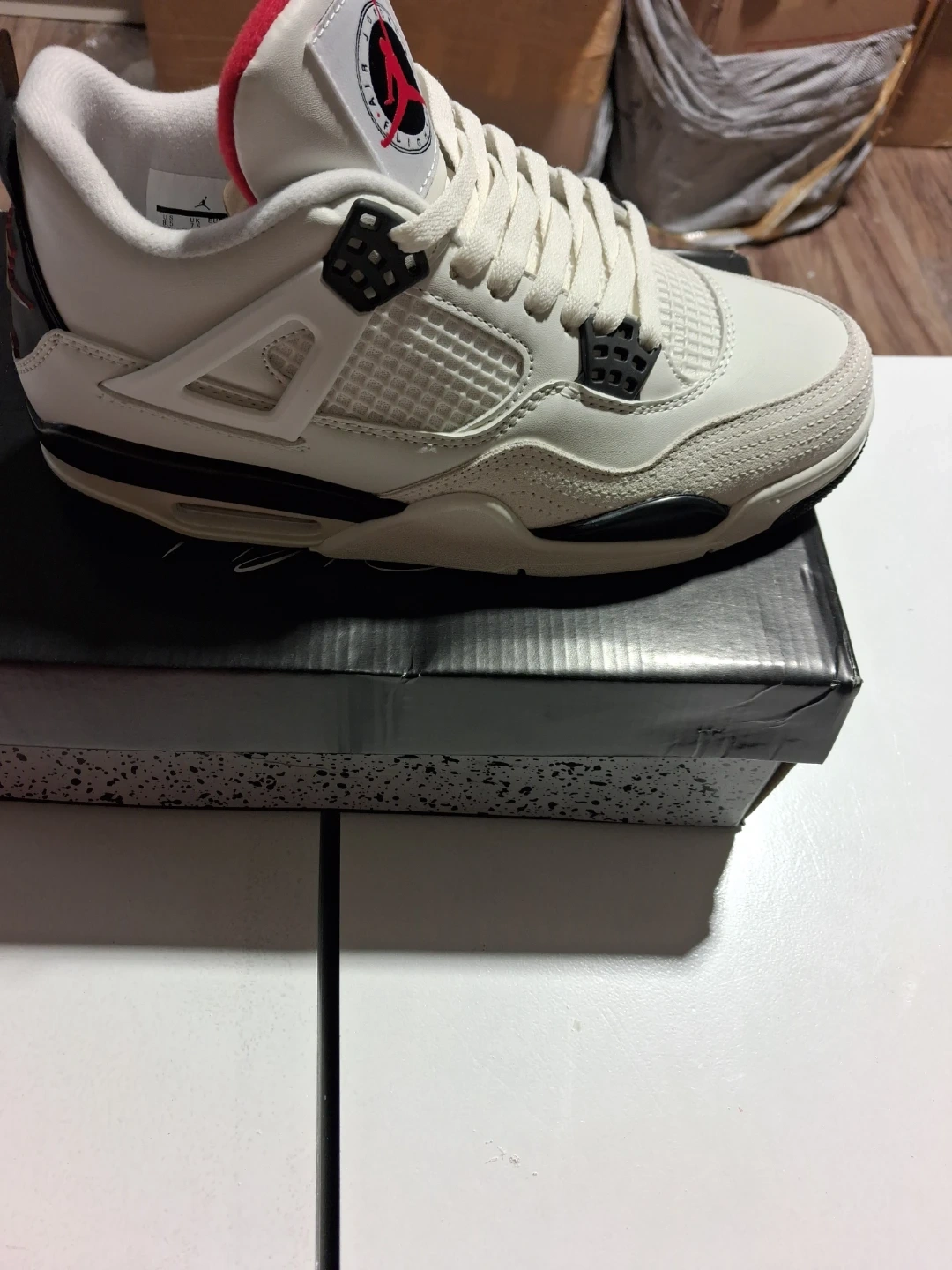 This is a pair of Air Jordan 4 Retro 'Lightning' sneakers. They're white with black and red accents. Includes the original box, which has a speckled design.