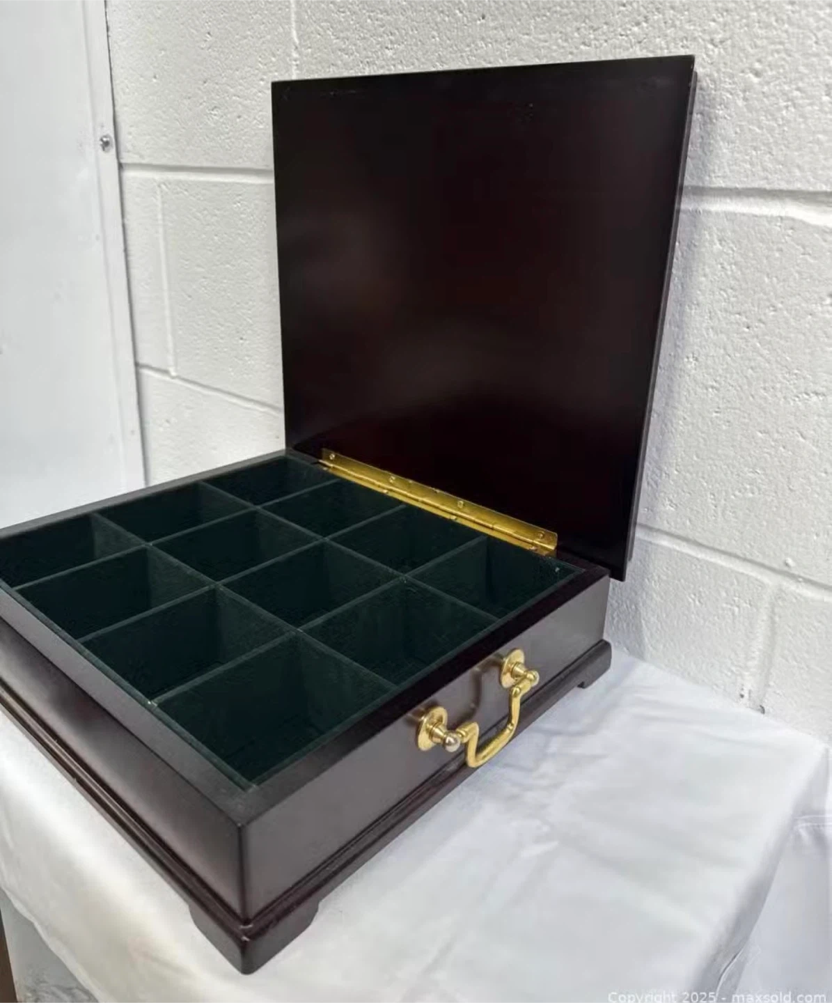 This dark wood organizer box features 16 compartments for storage. It has a classic design with a brass-toned handle and hinges. The interior is lined with green felt.