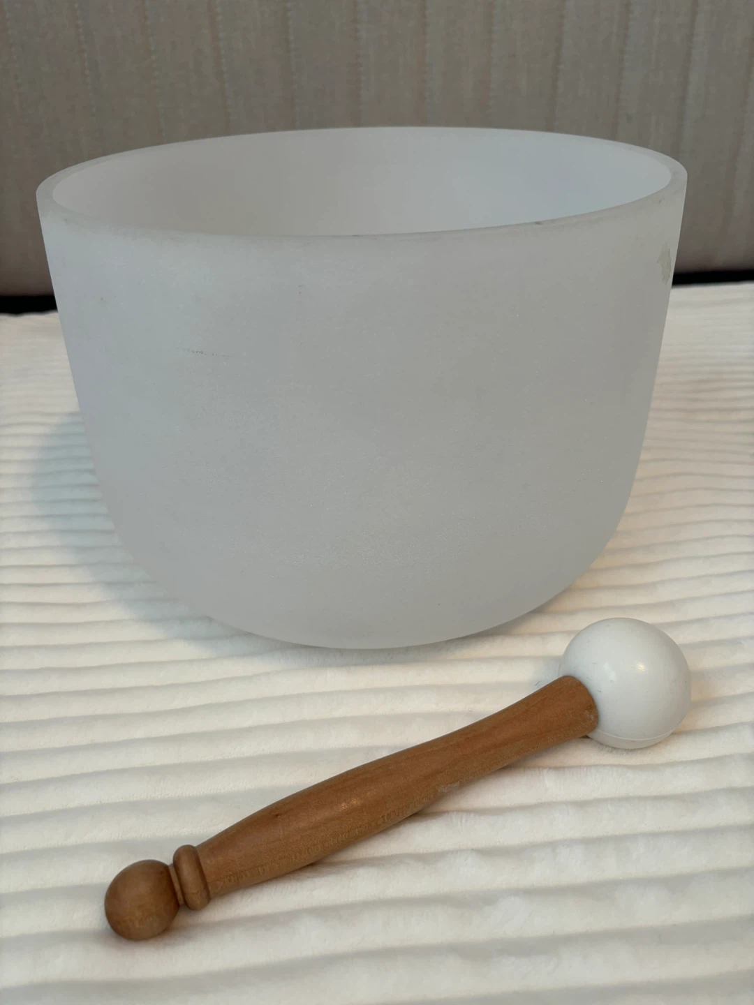 Seeking a beautiful addition to your meditation or sound healing practice? I am selling a 10-inch Frosted Quartz Crystal Singing Bowl, tuned to the therapeutic frequency of 432 Hz.