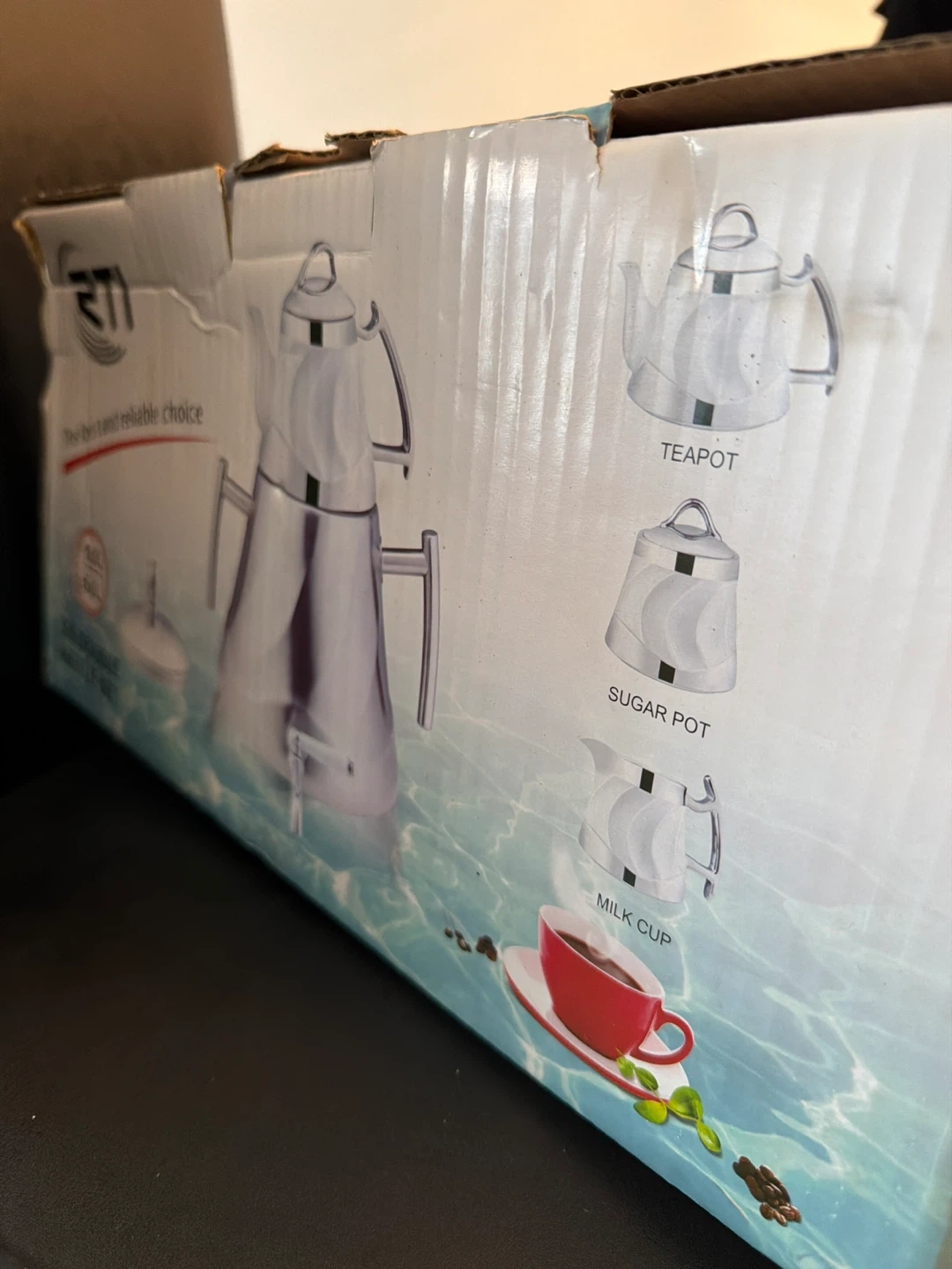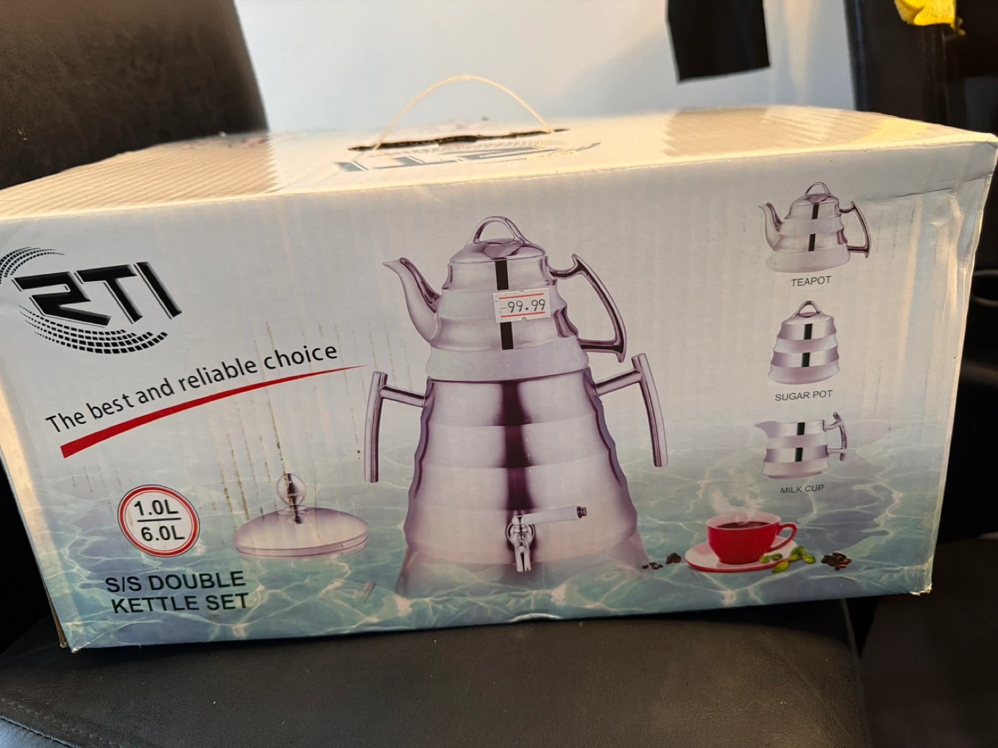 This RTI S/S double kettle set includes a teapot and milk cup. It's made of stainless steel with a 1.0L and 6.0L capacity. It's the best and reliable choice!