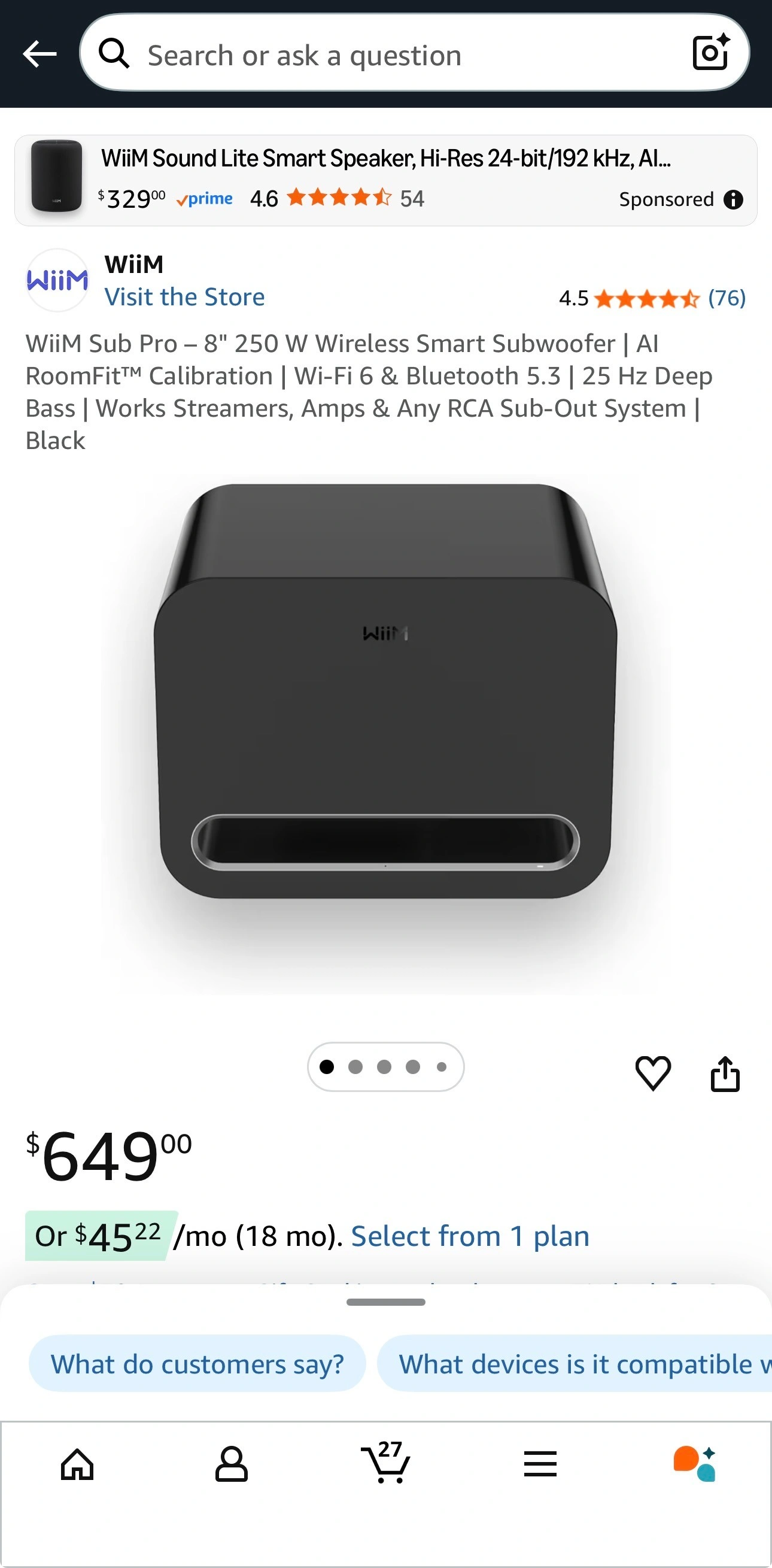 WiiM Sub Pro 8" 250W AI Wireless Smart Subwoofer Deepbase Wi-Fi6