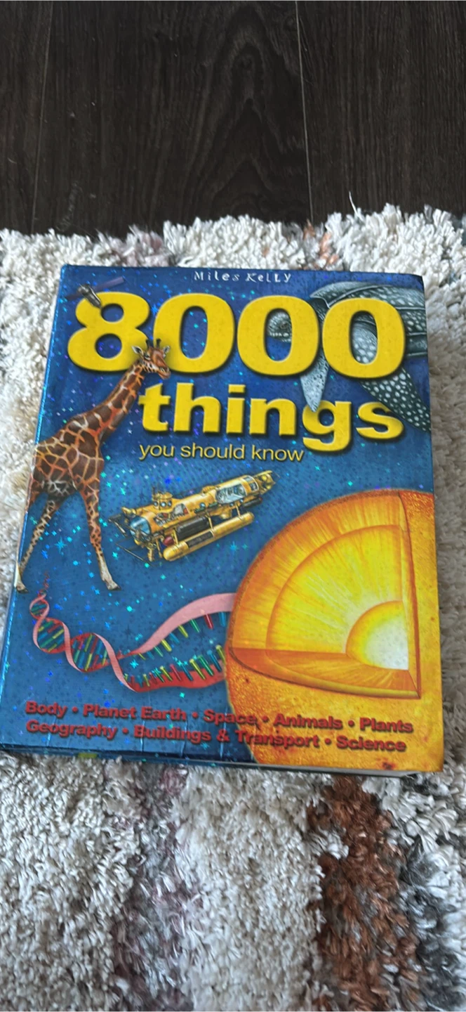 This is a reference book called 8000 Things You Should Know by Miles Kelly. It covers a wide range of topics including space, planet earth, wild animals, human body, science, buildings & transport, world geography, and plants. A great resource for learning!