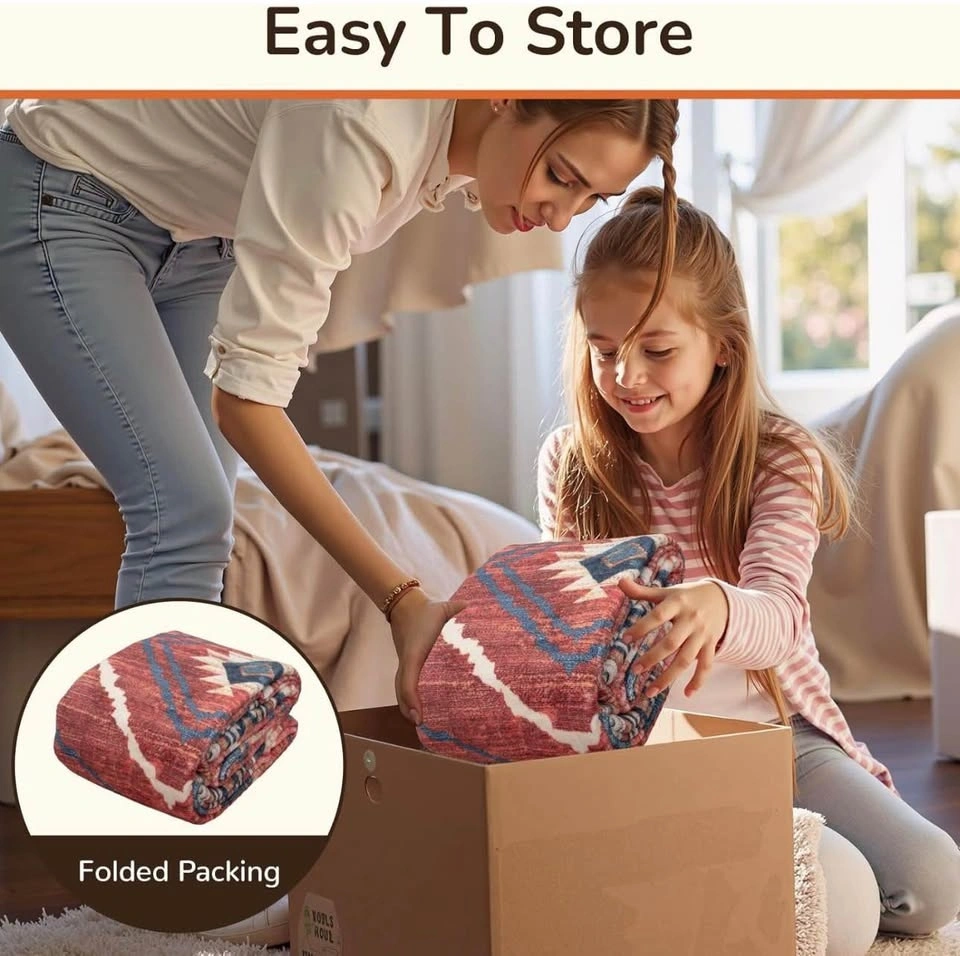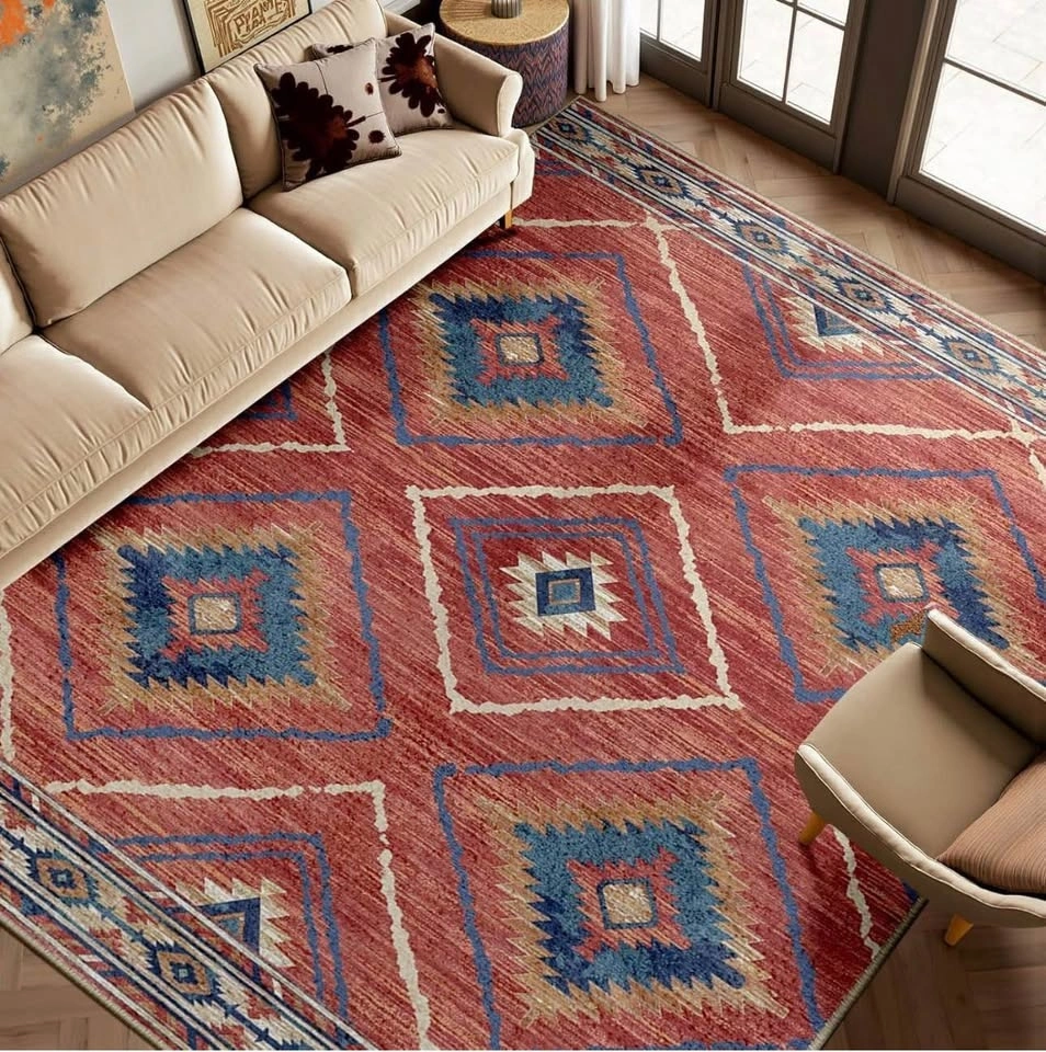Vibrant red area rug with blue and white geometric patterns. Super soft surface with reinforced edge and non-slip backing. Low pile (0.2 inch/5.1mm) so doors open and close easily. Machine washable and pet-friendly. Water repellent for easy spot cleaning. Also foldable for storage. Great for any room!