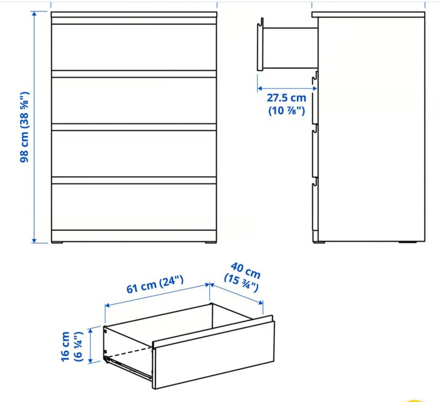 Great condition white dresser with 4 drawers. Measures 70 cm wide, 48 cm deep, and 98 cm tall. Drawer depth is 40 cm and width is 61 cm. Has a smooth and clean finish. Fourth drawer is defective