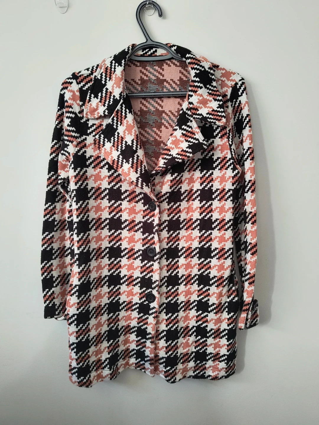 This is a stylish cardigan featuring a houndstooth pattern. It's a versatile piece with button closures and a classic collar. The material feels like a knit fabric, making it comfy to wear.