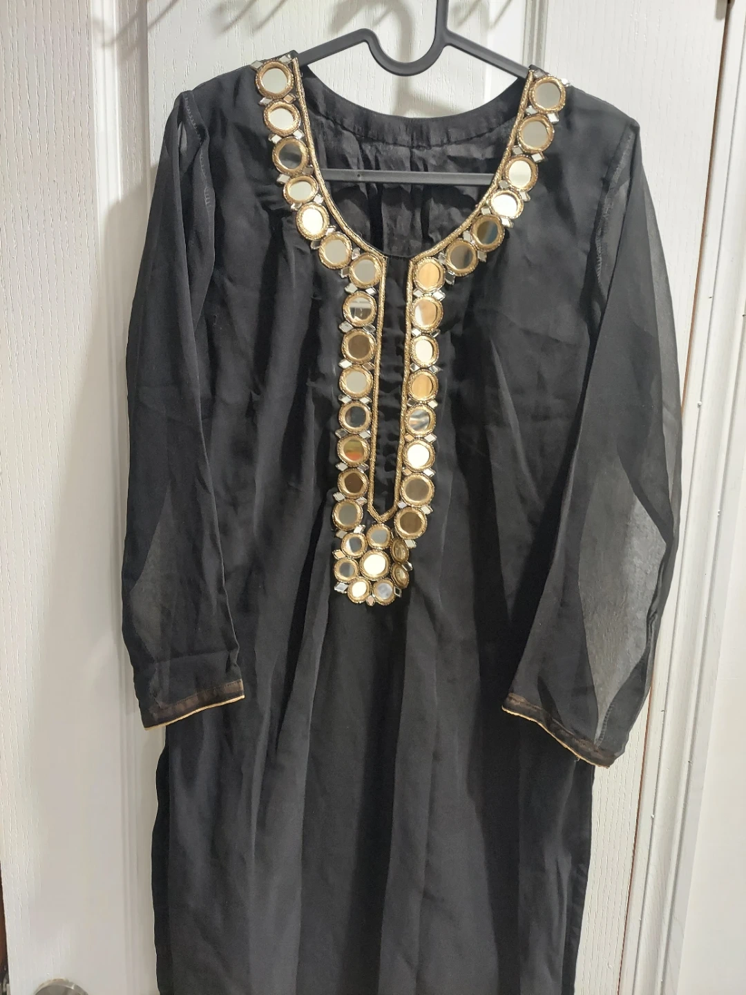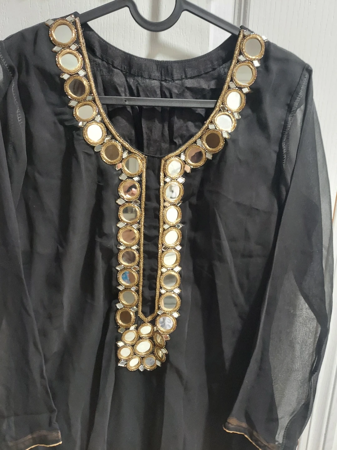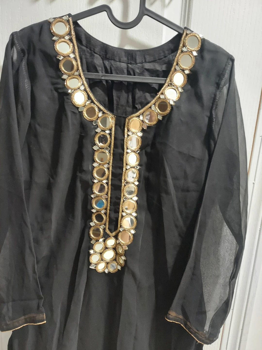 A black kurti featuring a decorative neckline with mirrors and gold trim. It's made of sheer fabric. This top is nice for festive occasions.