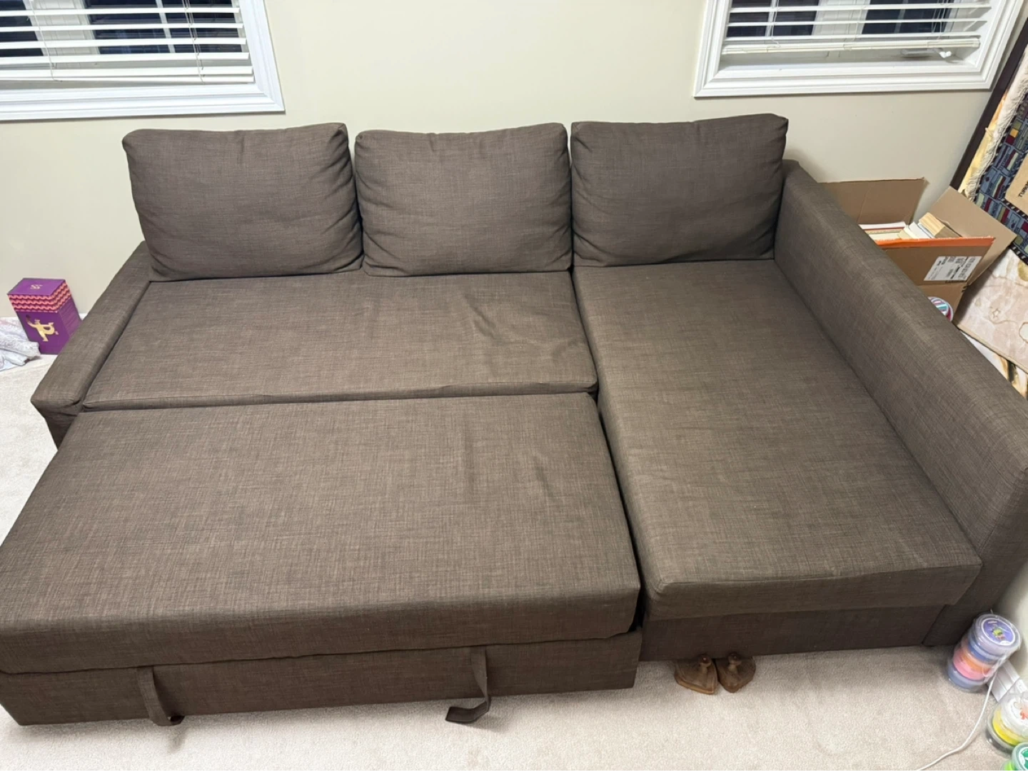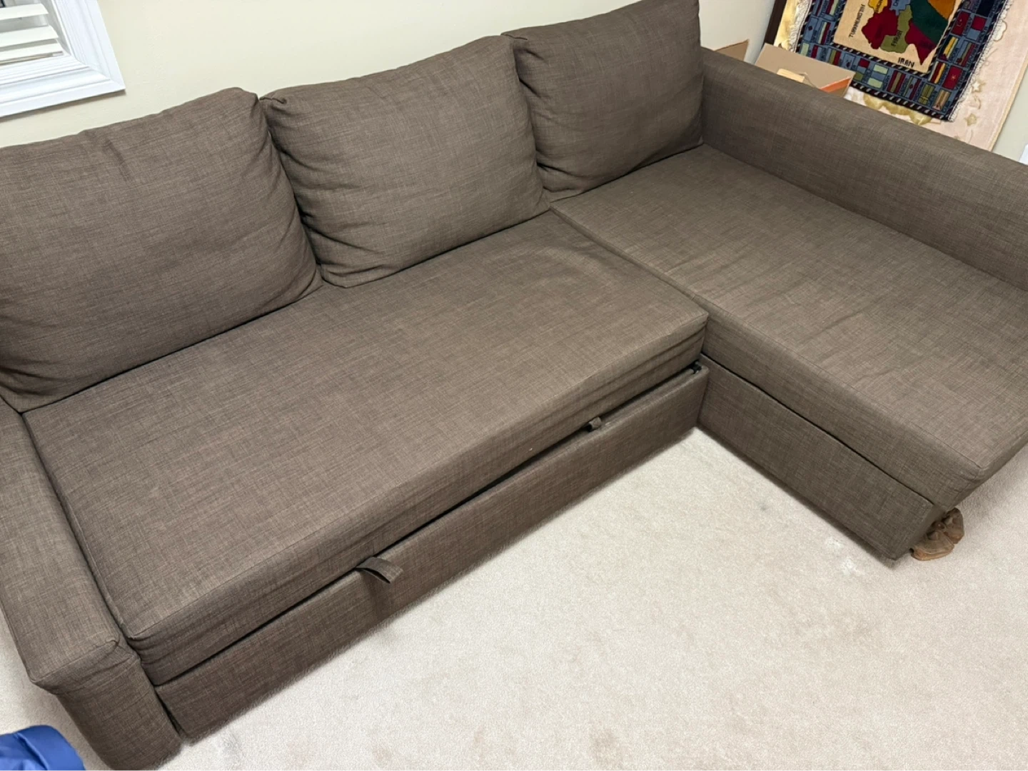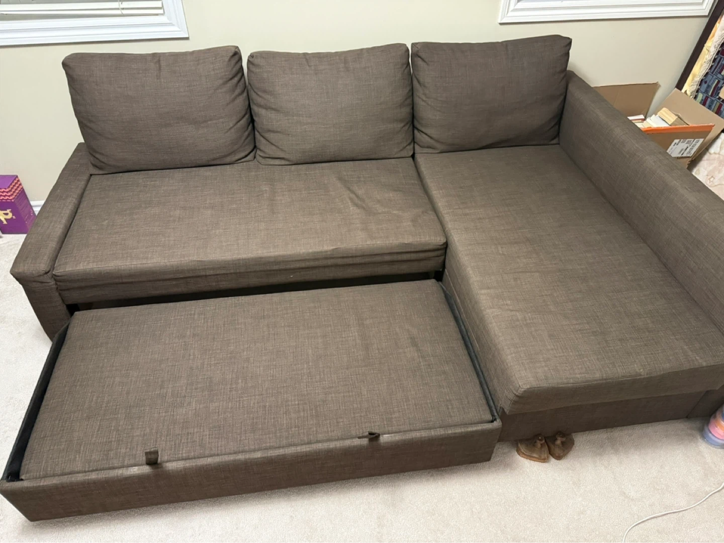 This is a brown sectional sofa with a pull-out bed and storage underneath. Upholstered in a durable, woven fabric. It's perfect for maximizing space in smaller homes or apartments!
