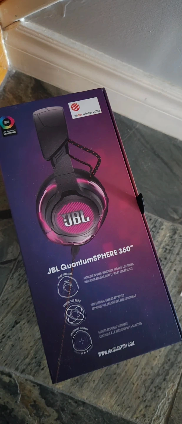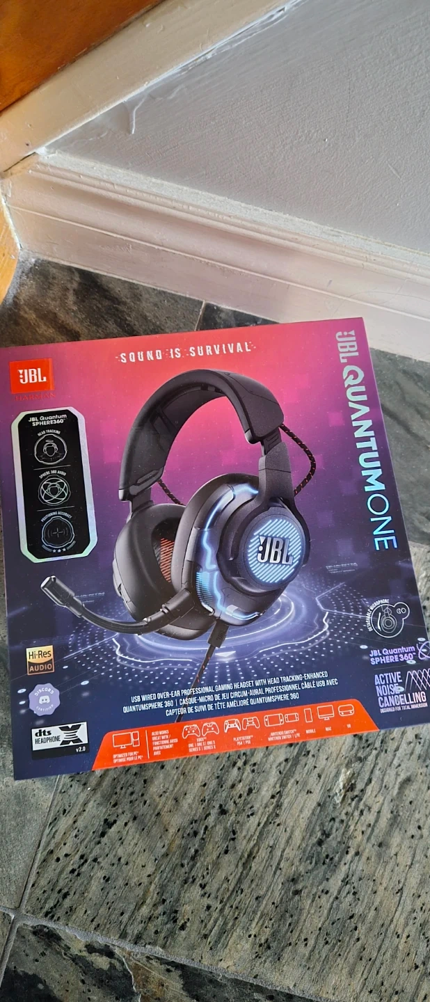 These are the JBL Quantum ONE gaming headphones. They feature active noise cancelling and JBL QuantumSPHERE 360 surround sound. Includes a detachable microphone.