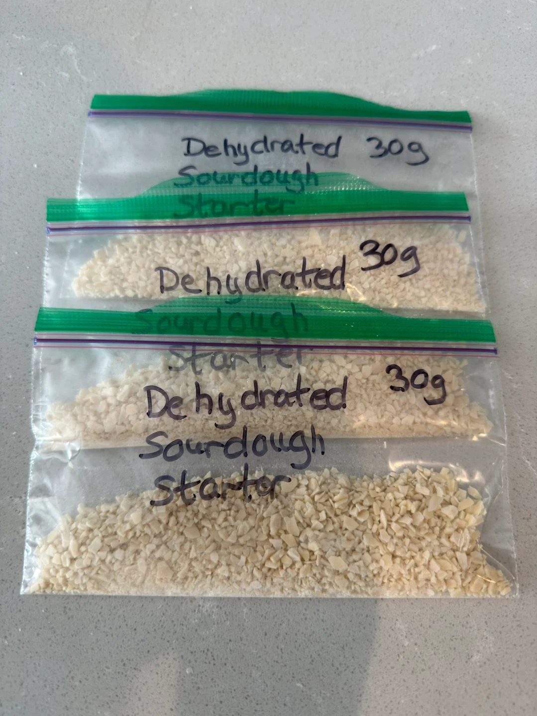 This listing is for dehydrated sourdough starter, each weighing 30g (3 bags available). It's perfect for reviving or starting a sourdough culture. Each bag contains dehydrated starter flakes.