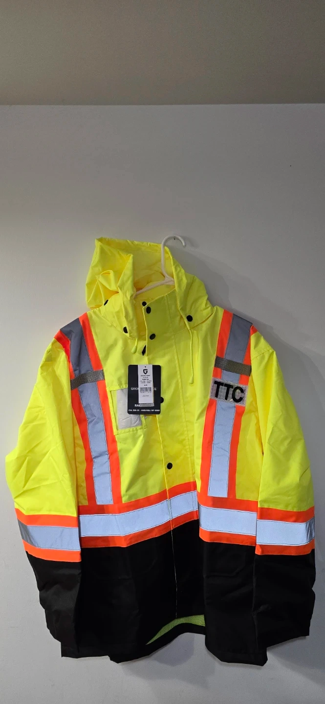 I have a brand new Ground Force workwear jacket. It's bright yellow with reflective stripes and the TTC logo on the back. Perfect for staying visible and safe on the job!