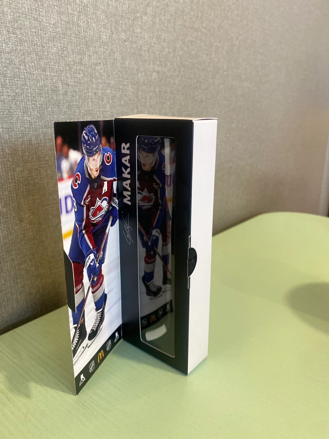 This is a Cale Makar figure from McDonald's. It's part of a hockey promotion. The box shows Cale Makar in his Avalanche jersey.