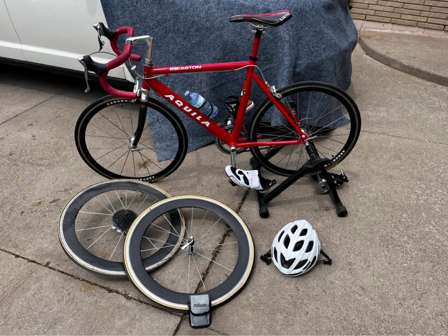 This is a red Aquila road bike. It's a complete setup with two sets of wheels, a water bottle, and a white helmet. It also includes a bike trainer stand.