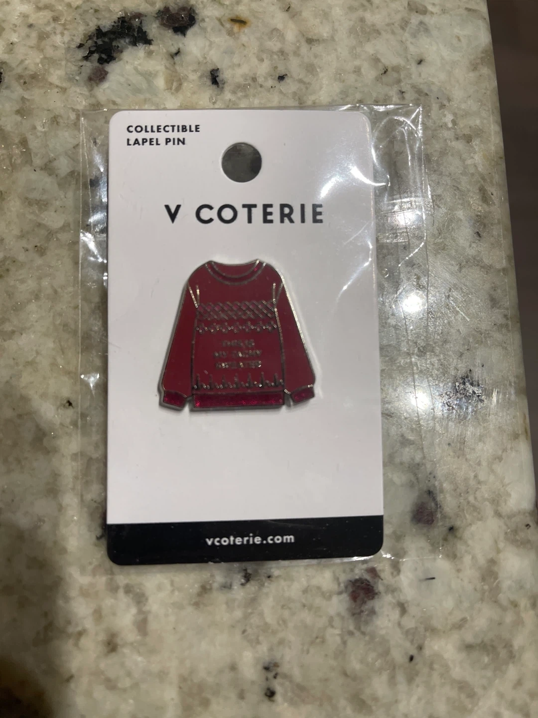 This is a collectible lapel pin from V Coterie, designed to look like a red sweater. It's a fun accessory for jackets or bags. The pin is new and comes on its original backing.
