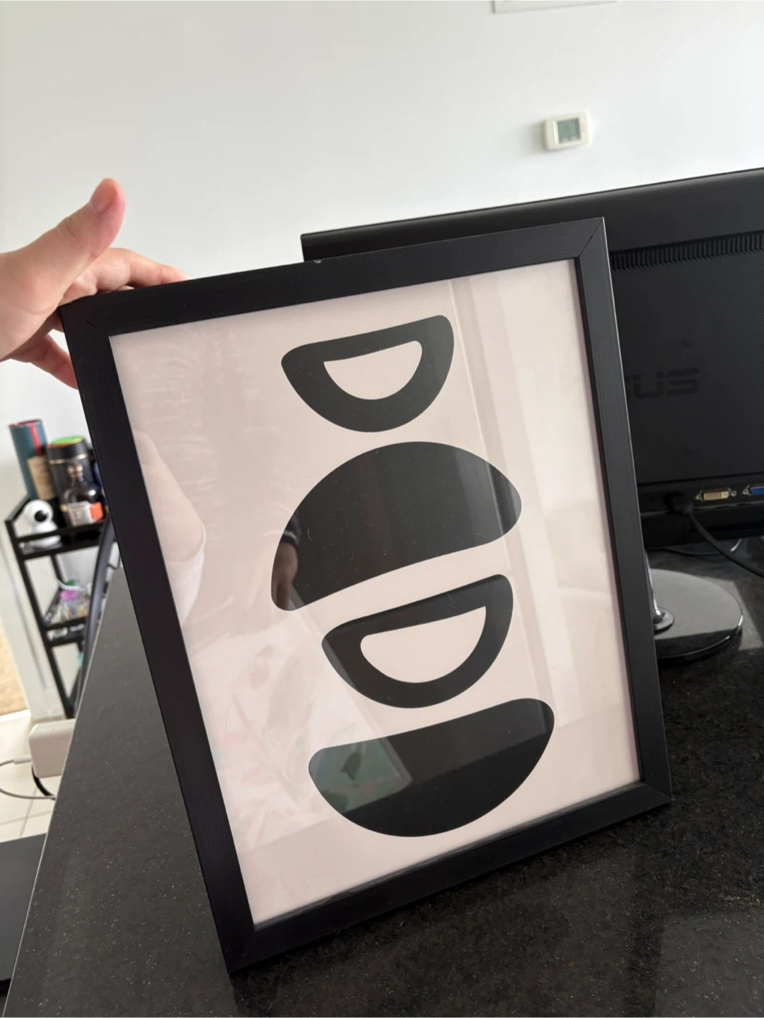 This framed art print features a minimalist abstract design. It's housed in a simple black frame. The print's modern aesthetic complements various decor styles.