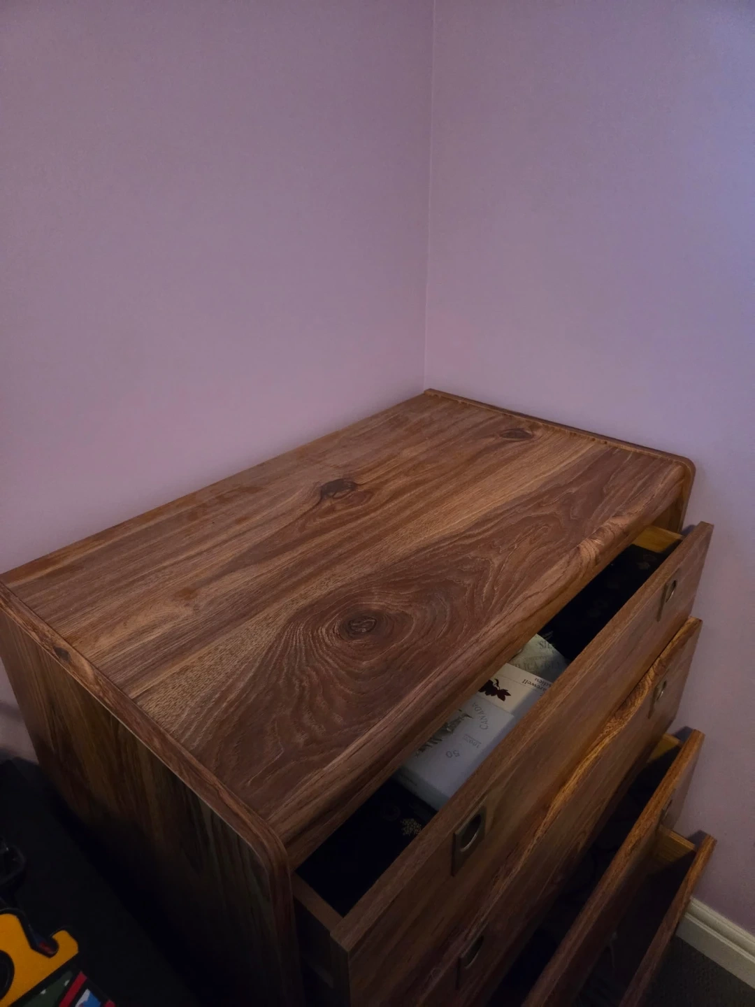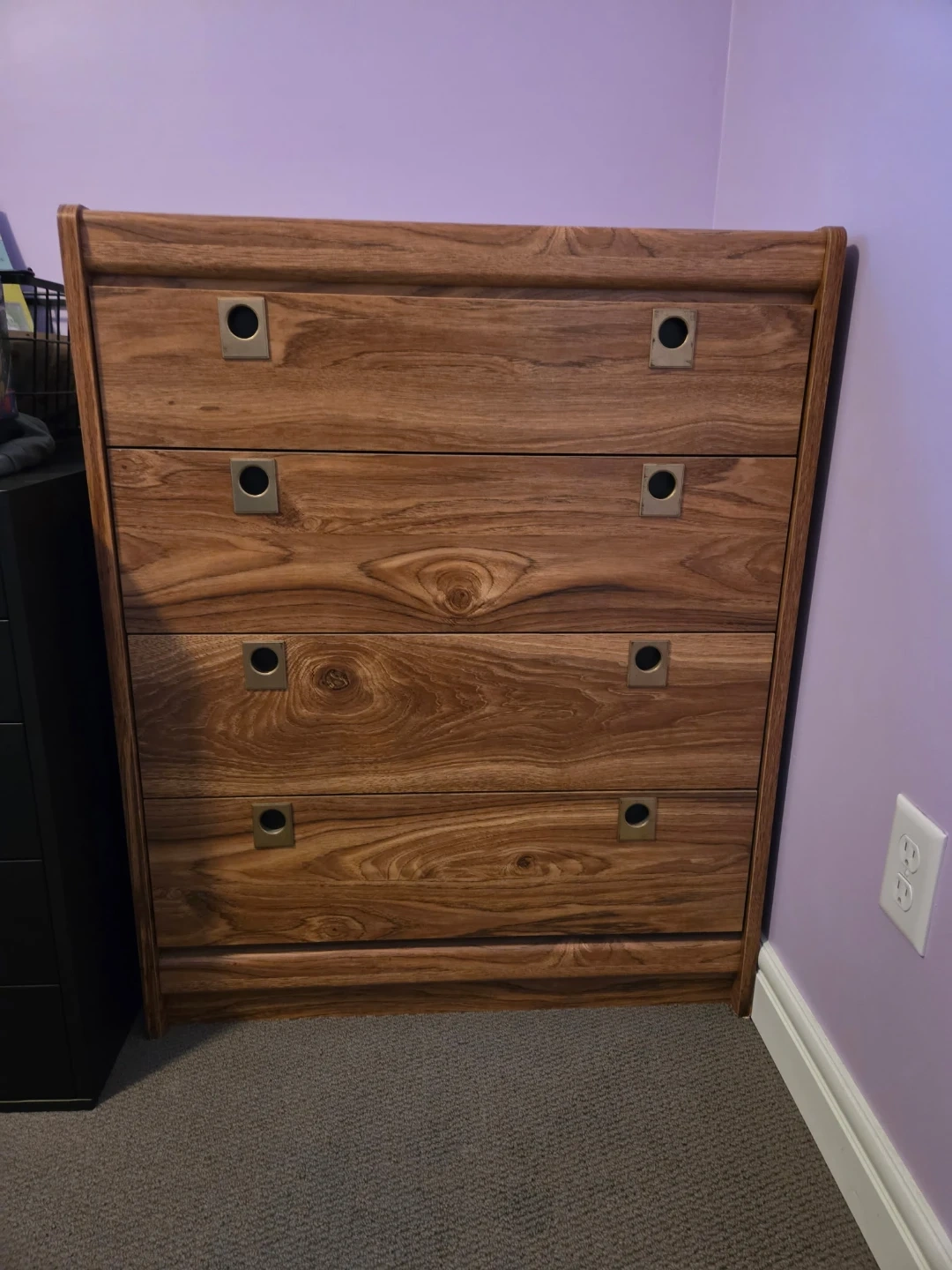 Here's a lovely wooden dresser with four drawers. It's perfect for adding some extra storage to your bedroom or any other room in the house. The wood grain is really beautiful and adds a touch of warmth to the space