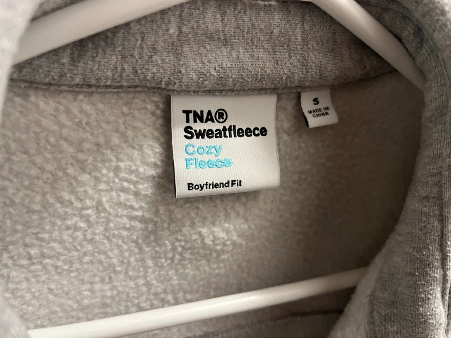TNA Cozy Fleece Boyfriend Fit shirt in grey. It's a size small, made in China. This cozy fleece shirt is great for layering or wearing on its own!
