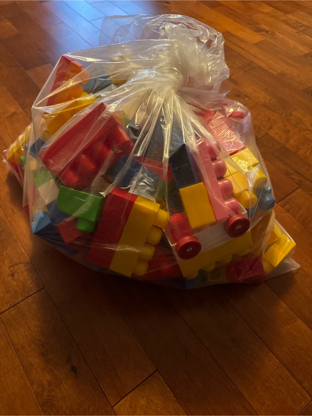 A large bag filled with over 200 assorted colourful building blocks. They're made of plastic and come in various shapes and sizes. Great for creative play!