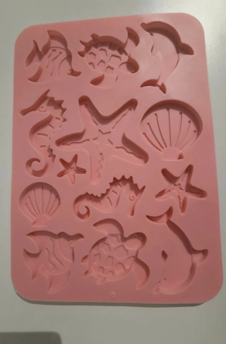 I'm selling a pink silicone mold with various sea creature shapes. It includes shapes like dolphins, turtles, starfish, seahorses, and seashells. This mold is perfect for making chocolates, candies, even for Clay activities