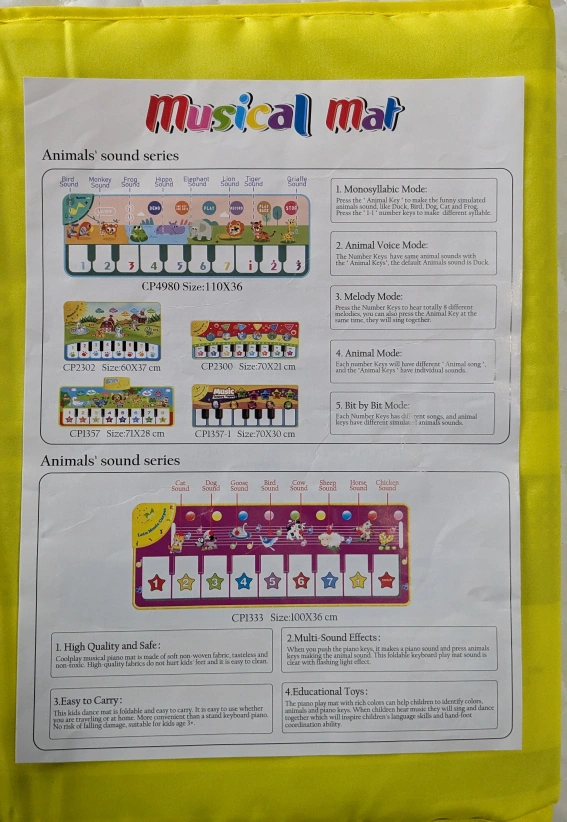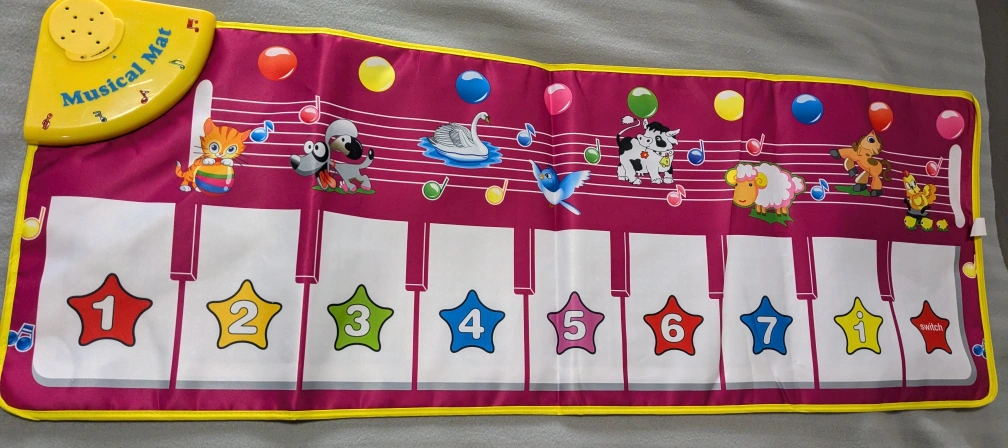 This musical mat is perfect for kids! It features both instrument sounds and animal sounds for interactive play. It's made of soft non-woven fabric and is easy to carry. The mat is foldable and safe for kids aged 3+! Great for developing language skills and hand-foot coordination. if the ad is still up it's available