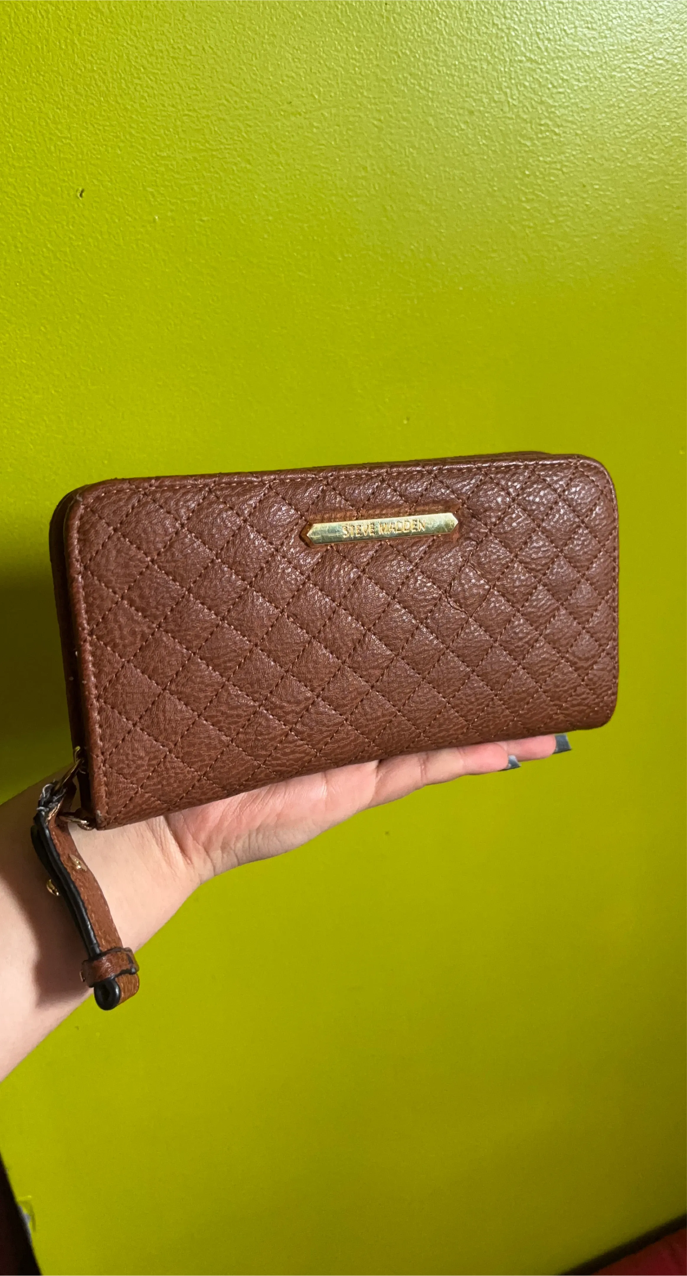 Selling a Steve Madden wallet in brown. It's in good condition and has a stylish quilted design. Perfect for keeping your essentials organized!