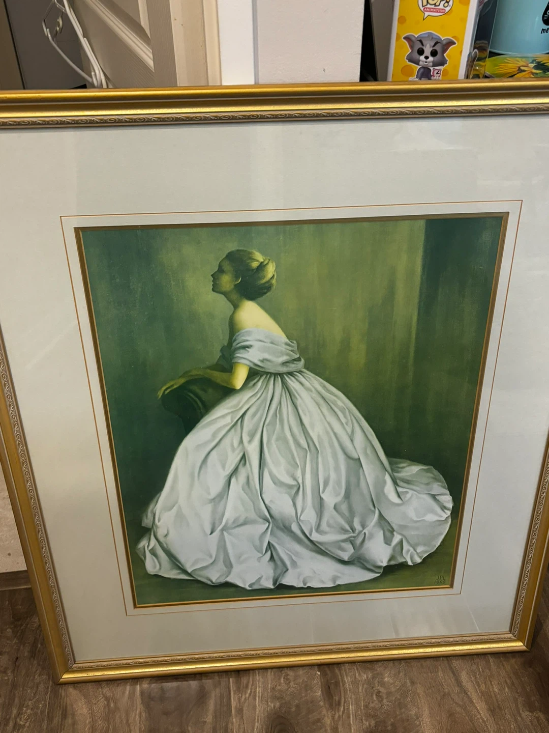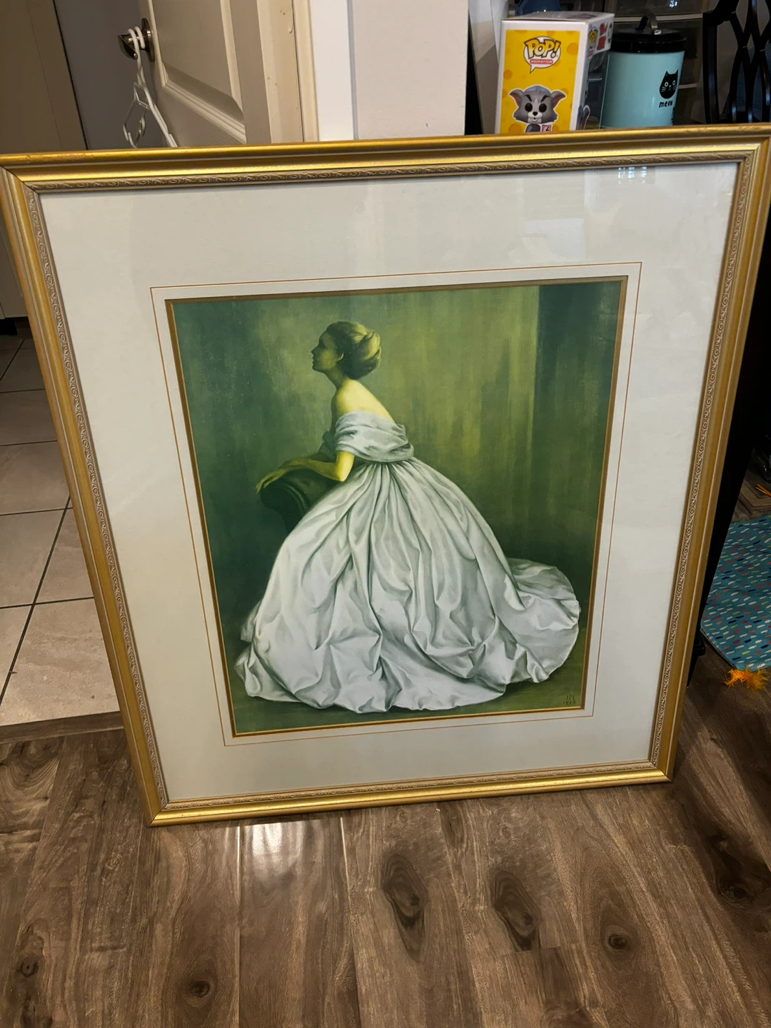 Framed painting featuring a woman in an elegant gown. The artwork is presented with a gold-toned frame and a white mat. This piece would add a touch of classic sophistication to any room.