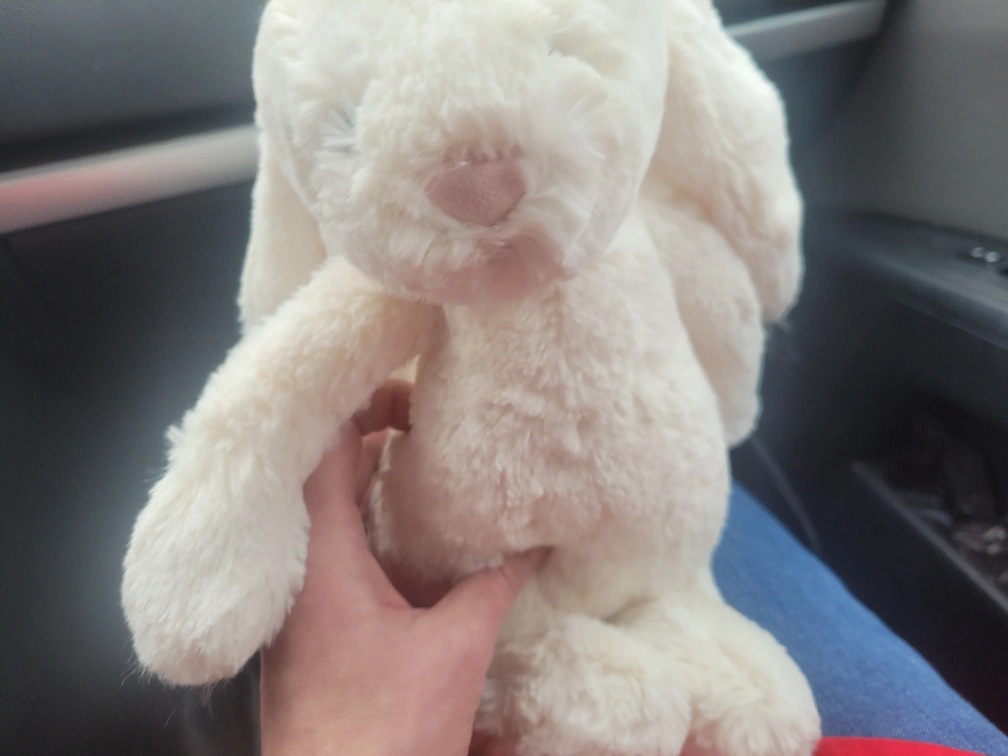 This is a Jellycat Bashful Bunny plush toy. It's super soft and cuddly. The bunny is cream coloured and has a lovely, gentle expression. It's a popular size for babies and children!