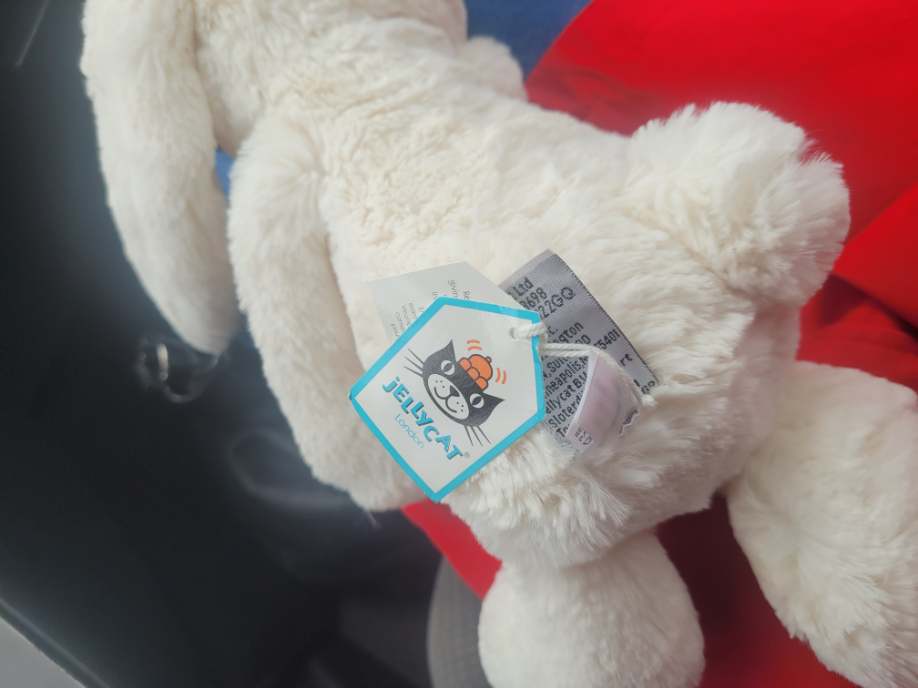 This is a Jellycat Bashful Bunny plush toy. It's super soft and cuddly. The bunny is cream coloured and has a lovely, gentle expression. It's a popular size for babies and children!
