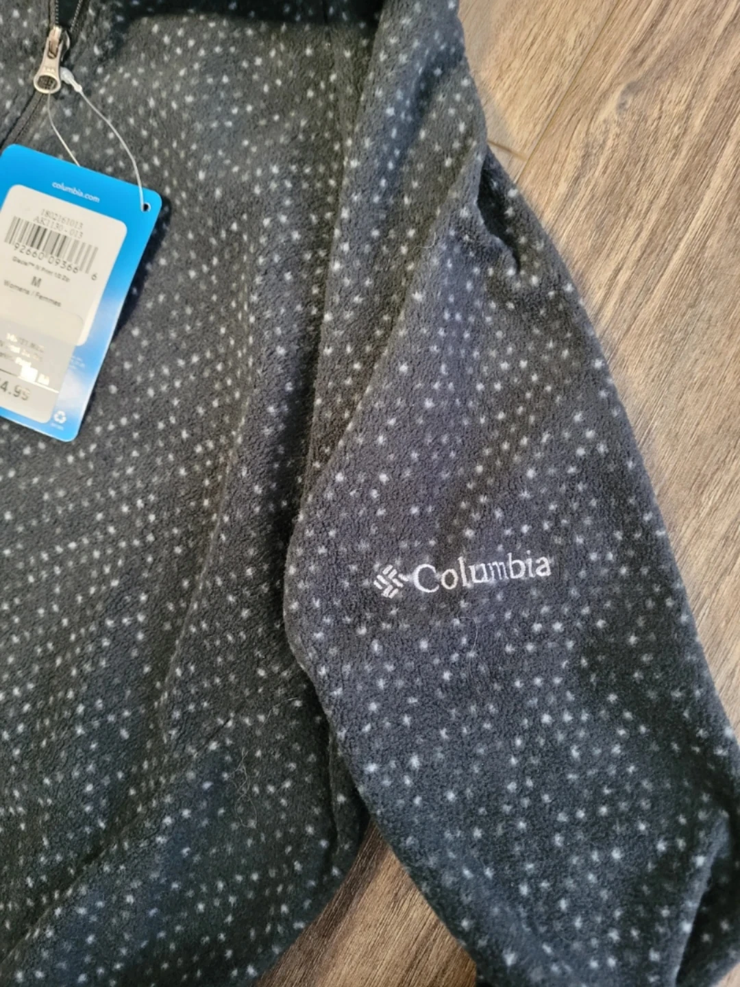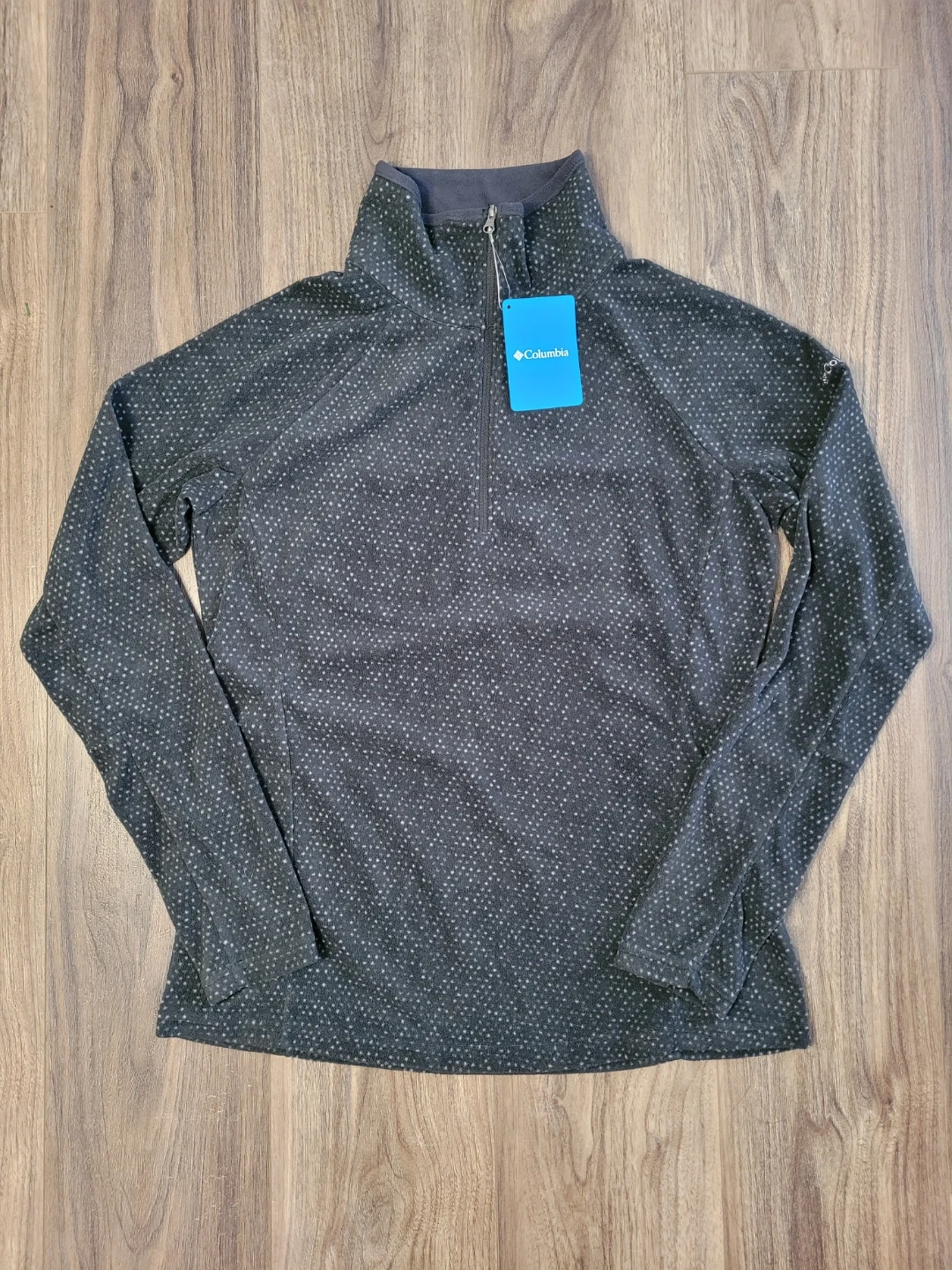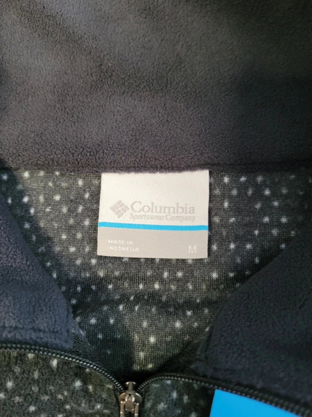 Columbia women's fleece jacket in a size medium. It's the 1/2 Zip style in the Black Sparkler print. This cozy fleece is made in Indonesia.