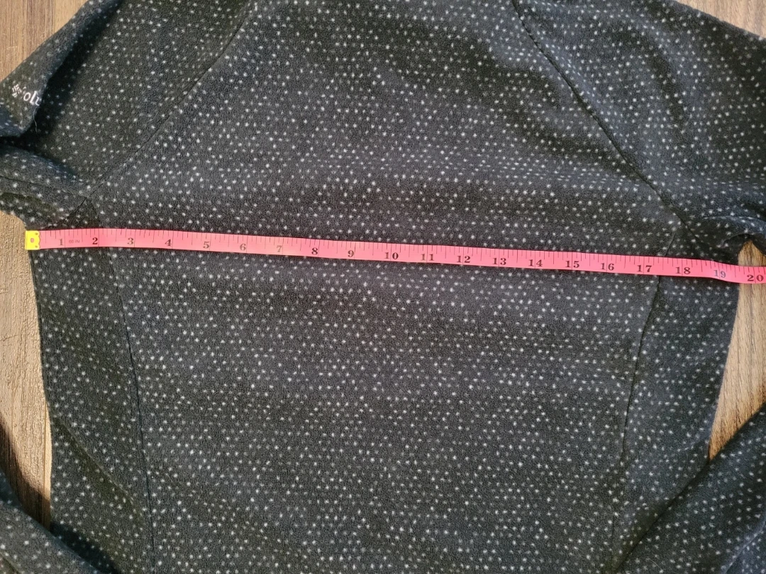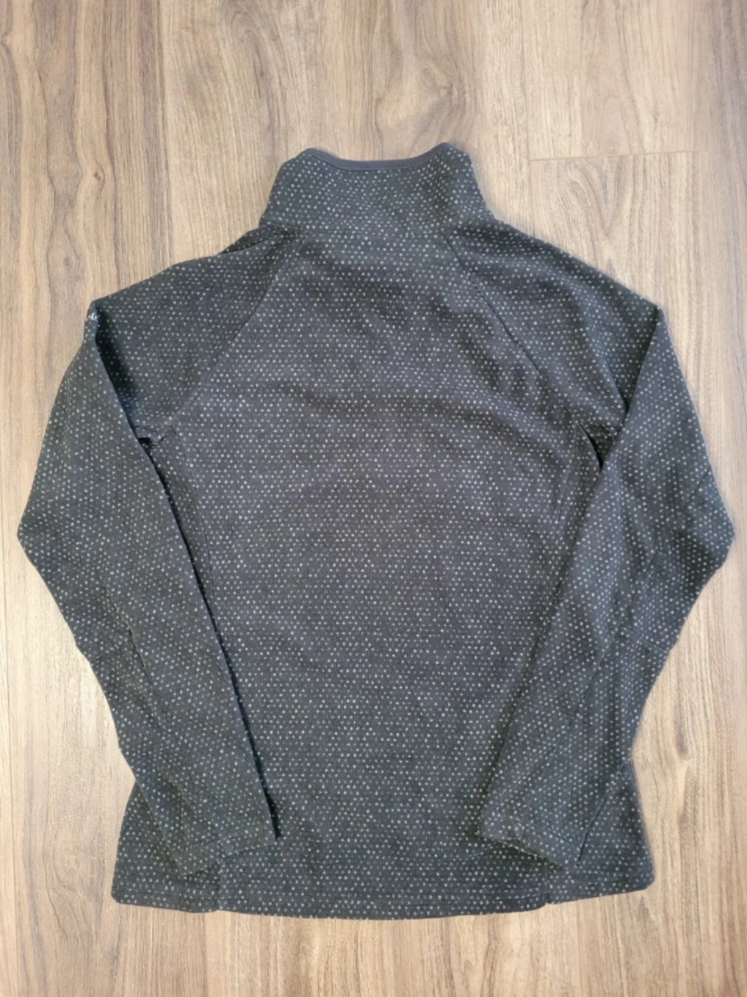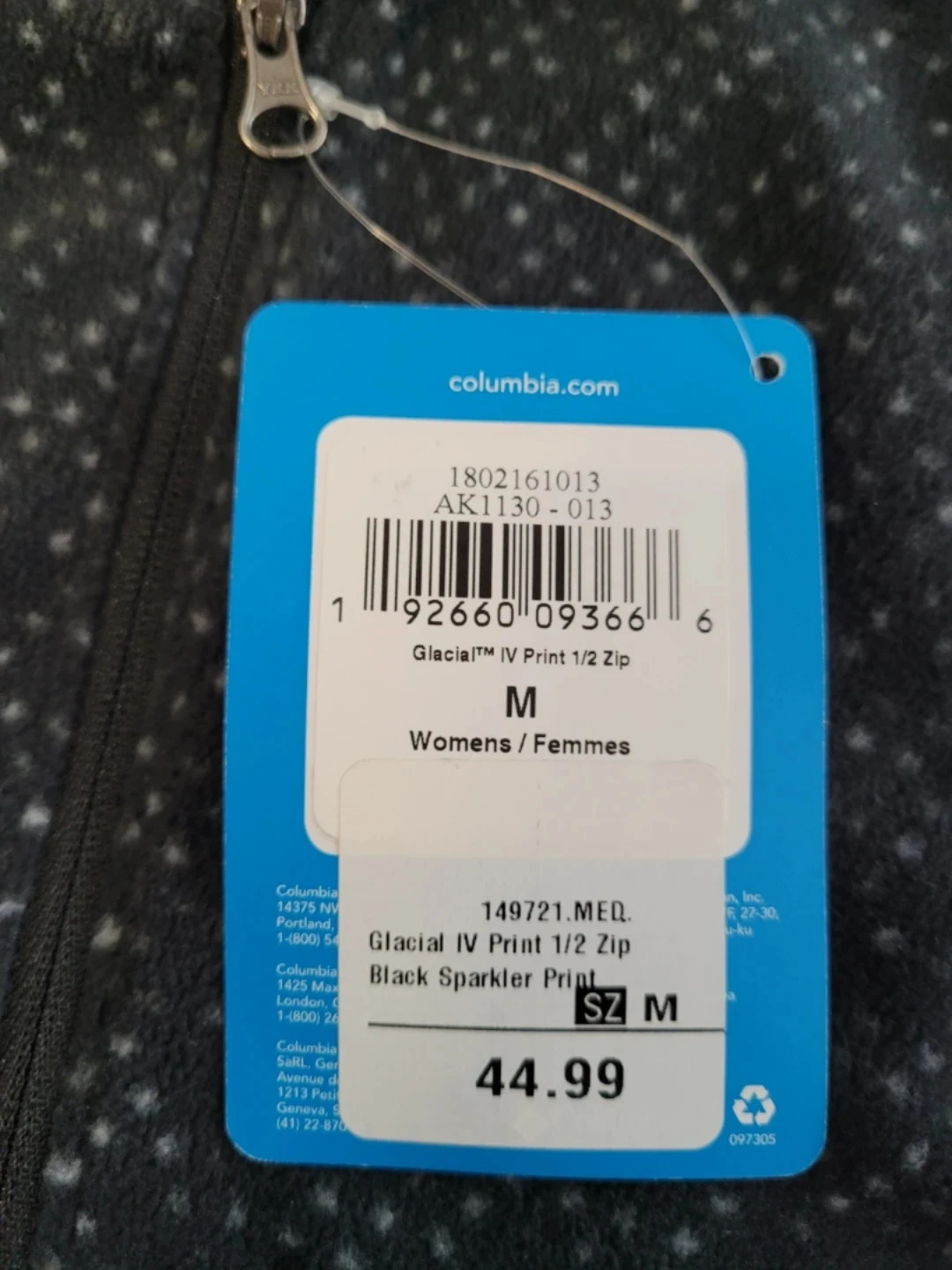 Columbia women's fleece jacket in a size medium. It's the 1/2 Zip style in the Black Sparkler print. This cozy fleece is made in Indonesia.
