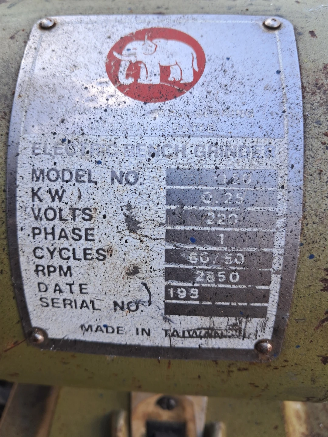 This is a Mammoth electric bench grinder. It runs on 220 volts and has a 0.25 KW motor. The grinder operates at 2850 RPM. This would be useful for sharpening tools or light grinding tasks.