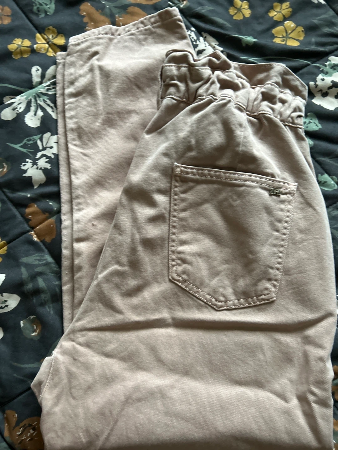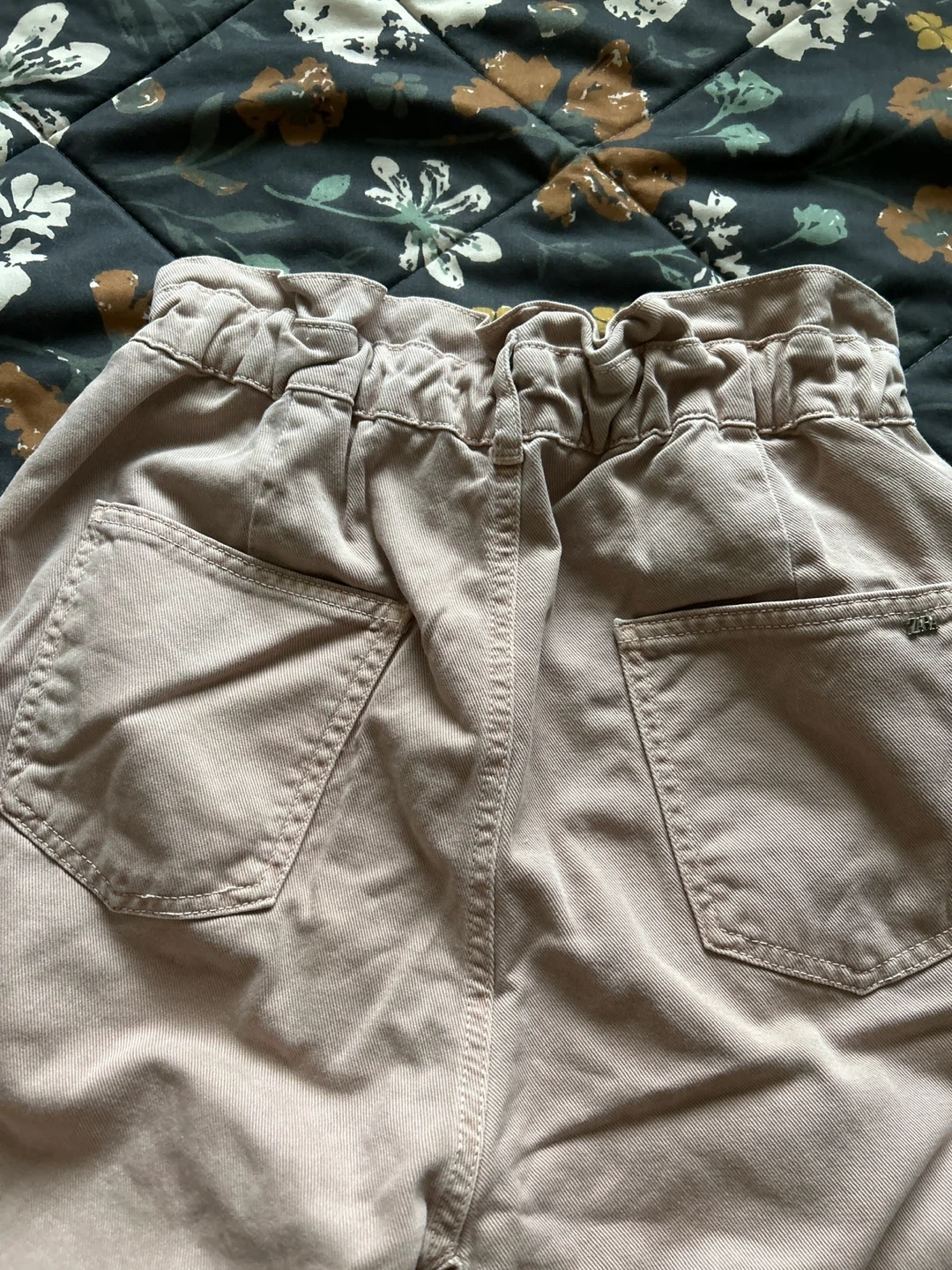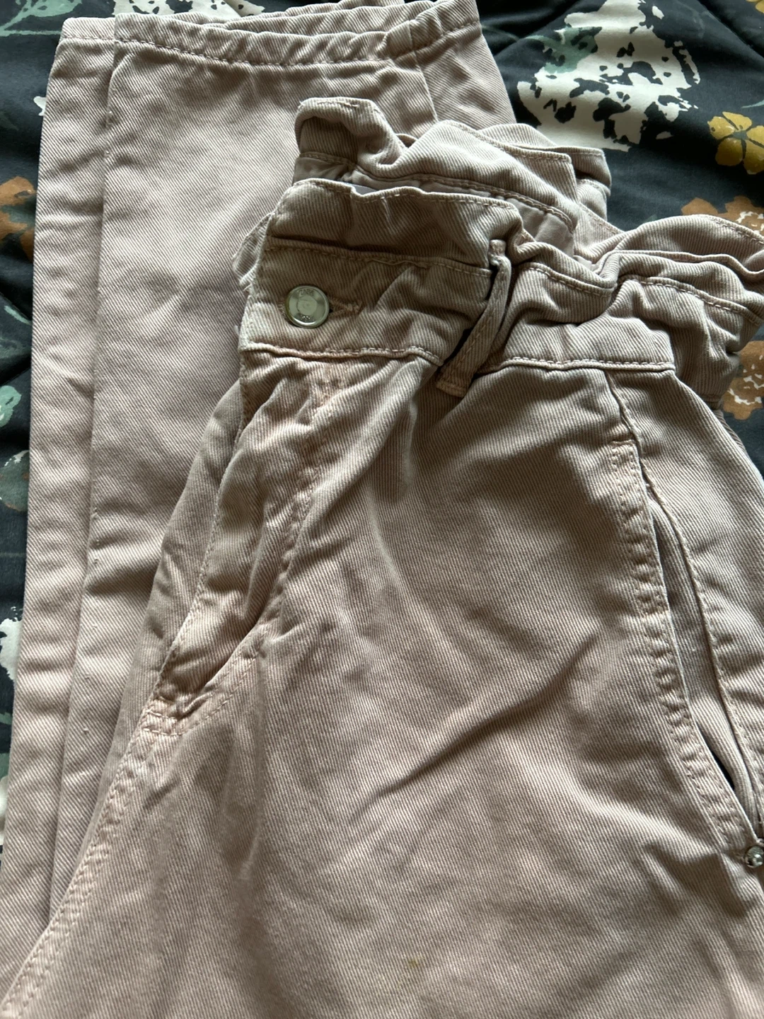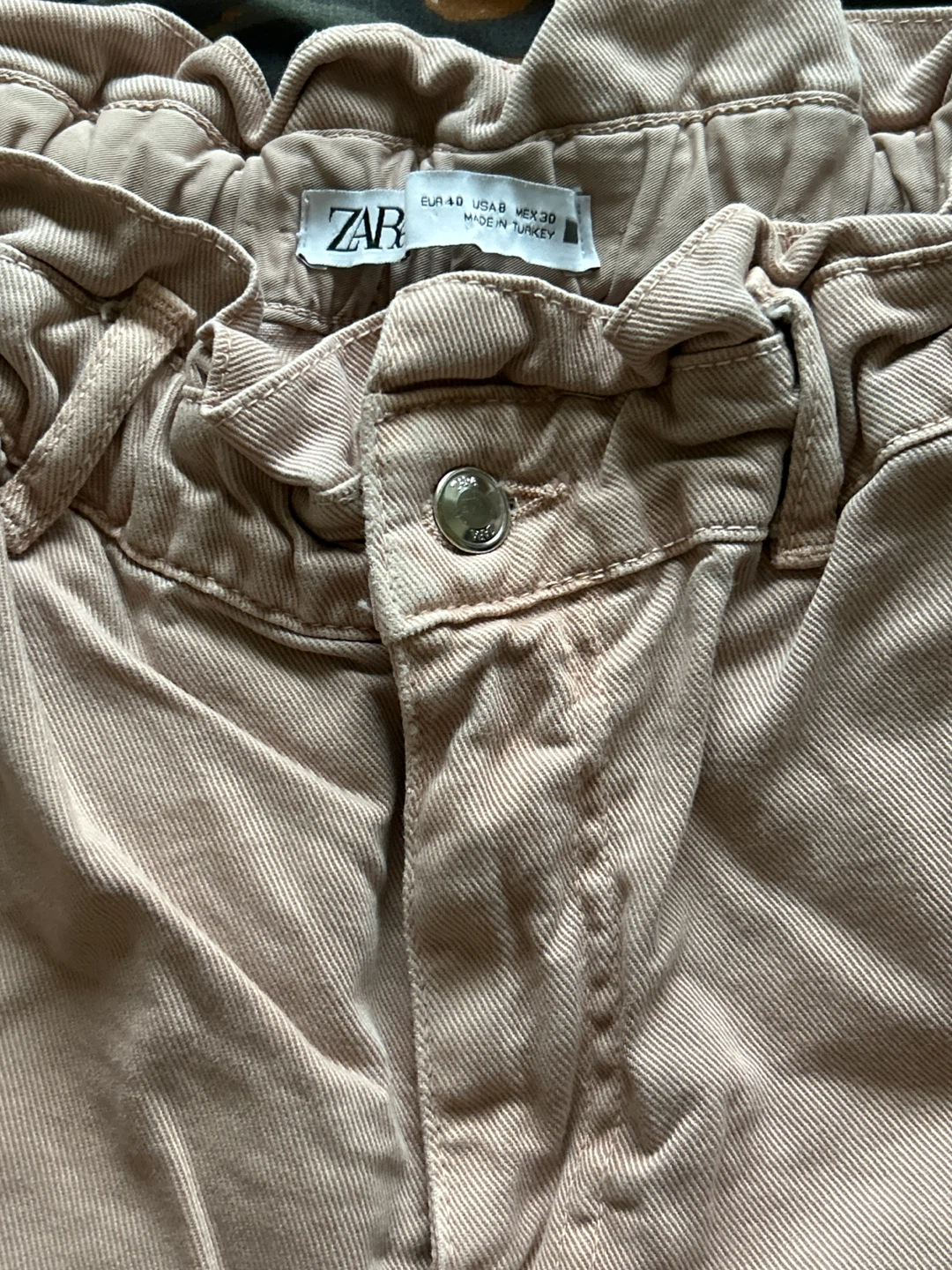 Women's Zara high-waisted paperbag waist trousers in a light beige colour. Made in Turkey. EUR 40, US 8, MEX 30 sizing. Elasticated waistband with button and zip closure.