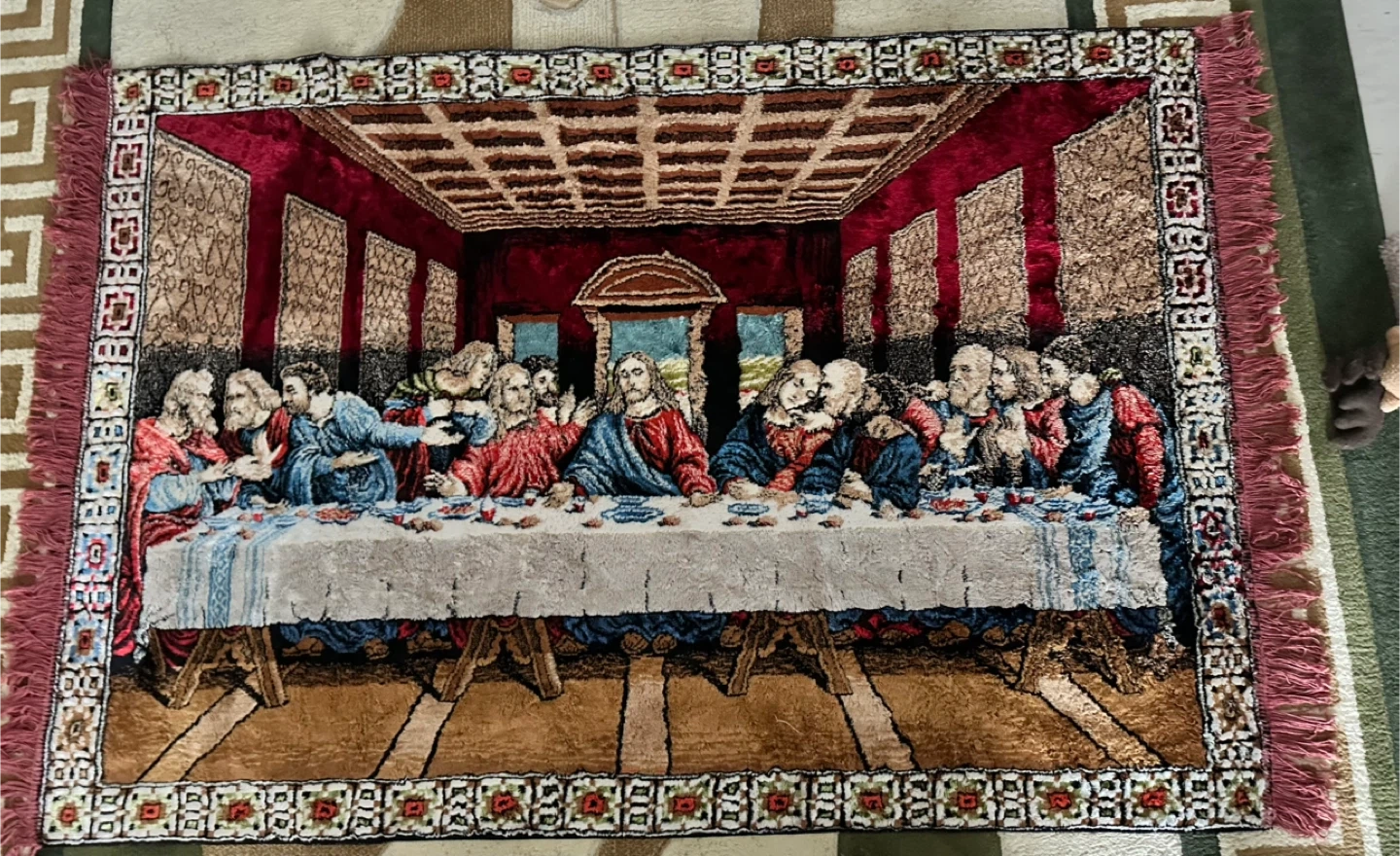 This tapestry depicts Leonardo da Vinci's 'The Last Supper'. It features intricate details and rich colours. The tapestry has fringed edges and a decorative border.