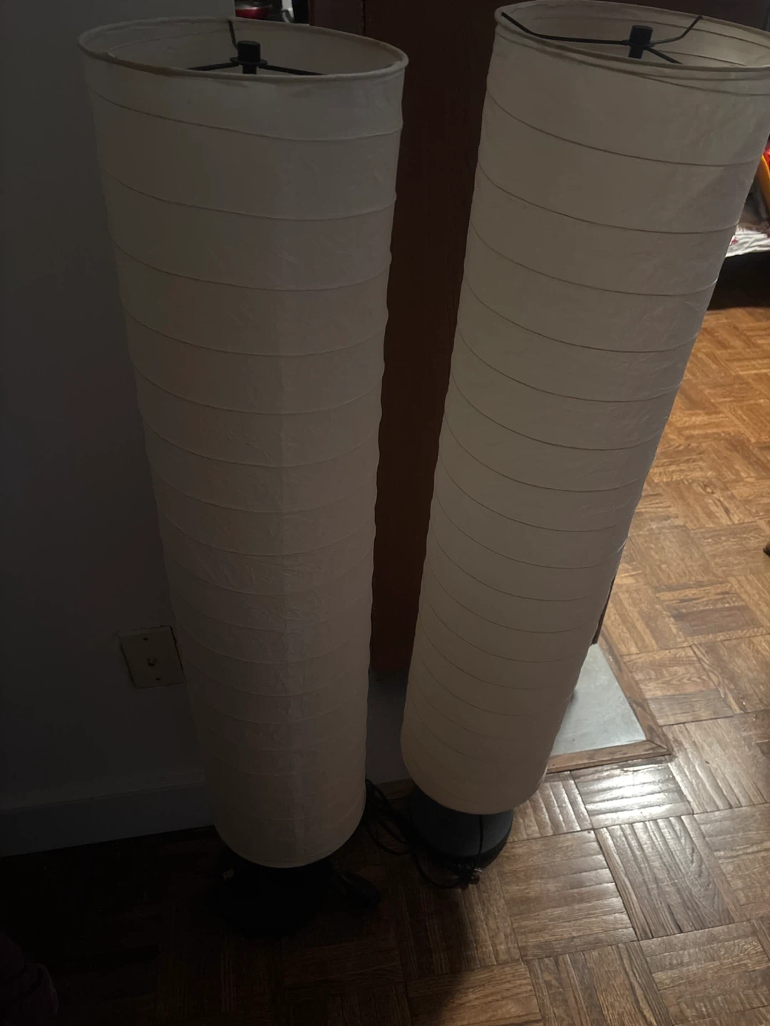 Two tall paper floor lamps with a neutral, off-white colour. These lamps provide a soft, diffused light. They're perfect for adding ambient lighting to any room in your home.