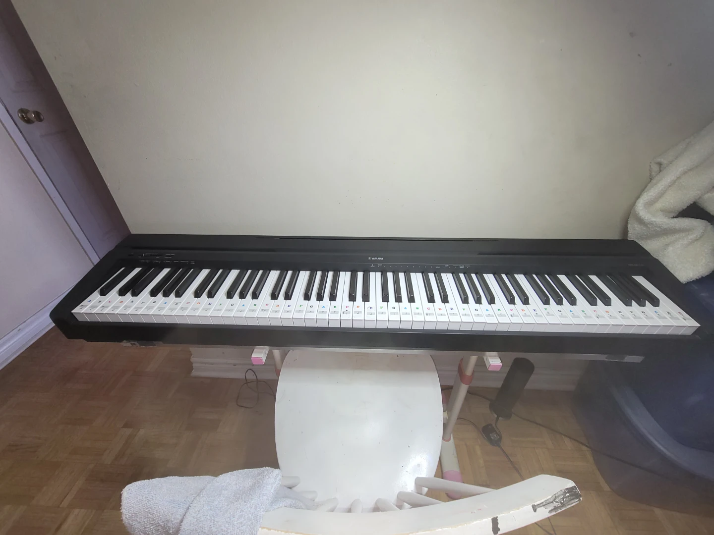 (THE LOWEST I CAN TAKE IS $370 EVERBODY ITS JUST A REMINDER!!!♡) This is a Yamaha digital piano. It features 88 keys and with note stickers on them. It's a great instrument for beginners learning to play.